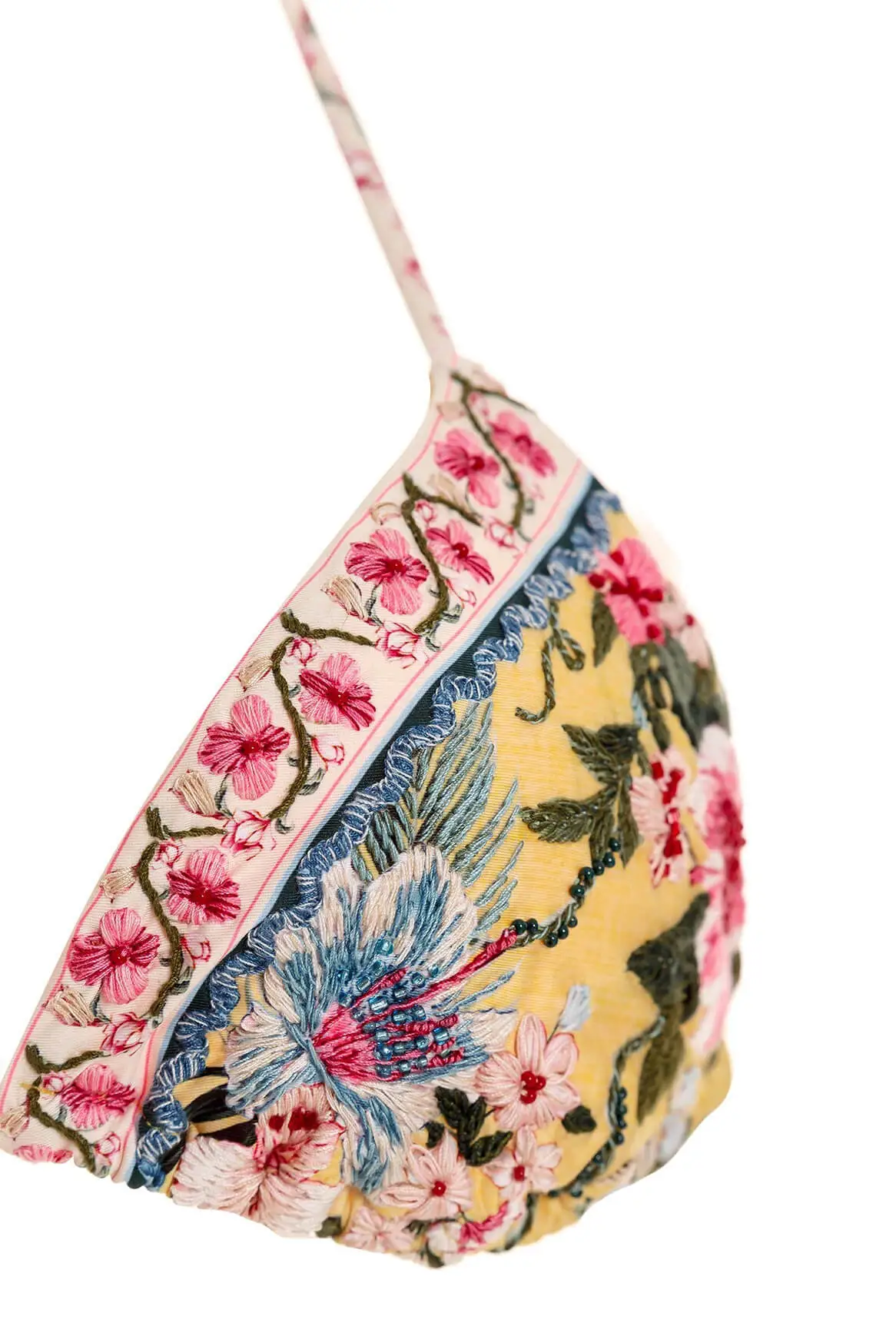 The Lolita Sally Top by Agua Bendita is a classic triangle bikini adorned with handmade crochet flowers. Agua Bendita’s suits are known for their unique details and vibrant colors – perfect for standing out on your next getaway.
