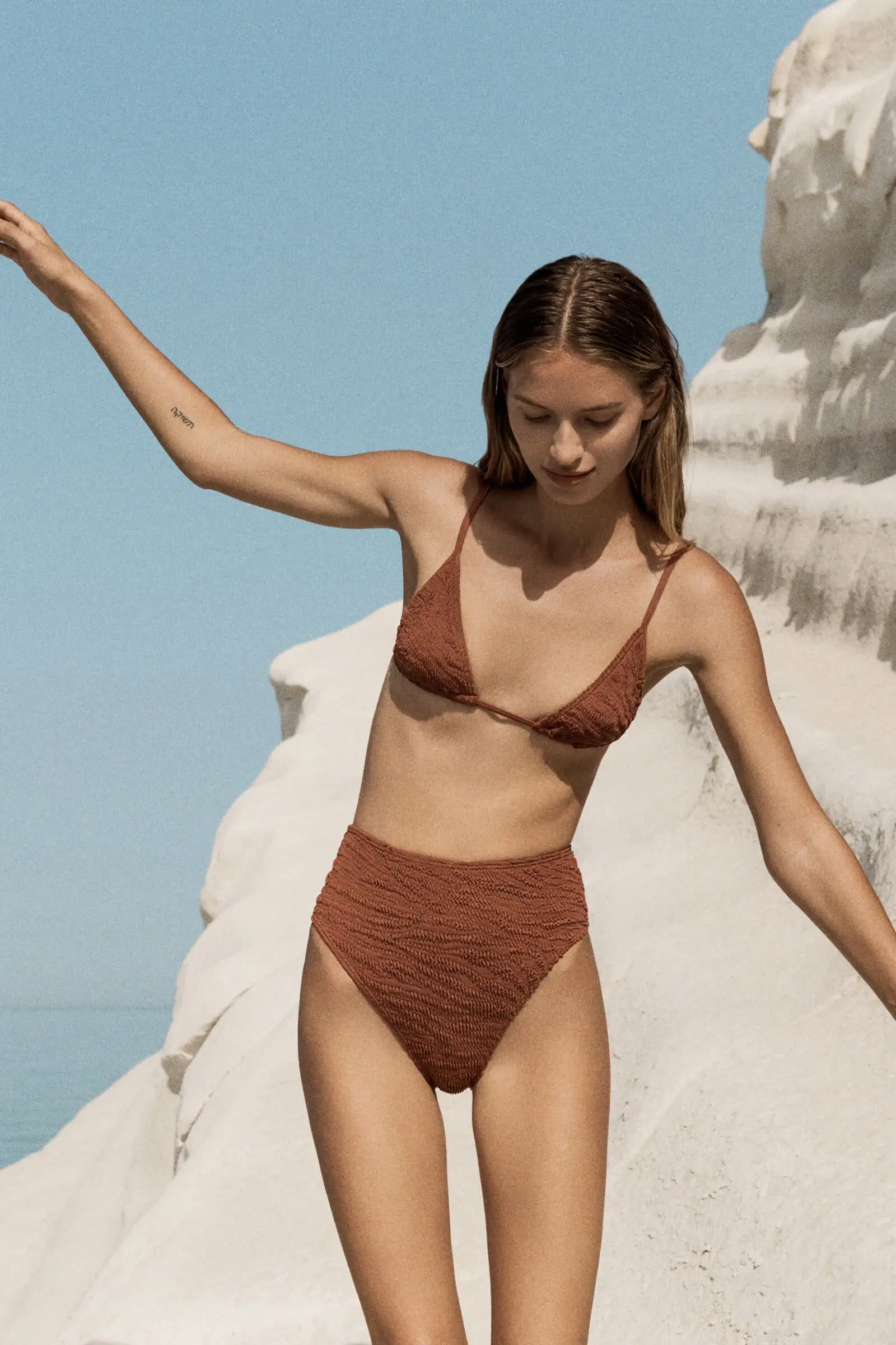 The Luana Triangle from Bound by Bond-Eye features an over the shoulder triangle cut and is made from ultra stretchy fabric that morphs perfectly to your body. It’s made in their newest fabric- the Tiger Texture Bound Crinkle Fabric, which is an exclusive jacquard knit.