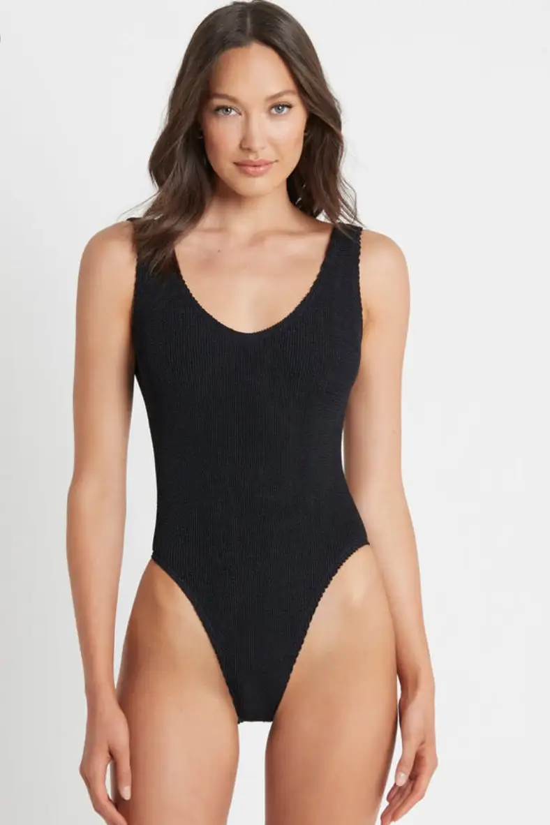 The Mara One Piece from Bound by Bond-Eye Australia features a plunge neckline, a scoop back, and medium coverage on the bottom- all in the Bound fabric we know and love- a stretchy smocked one size fits most fabric.