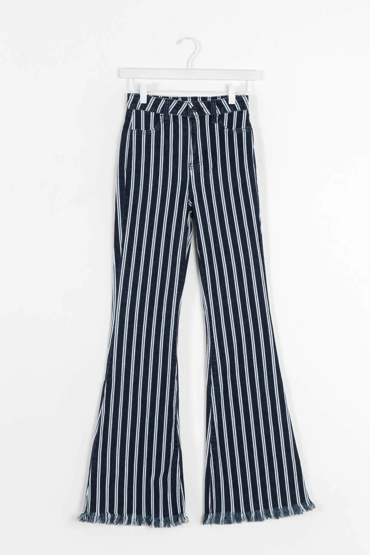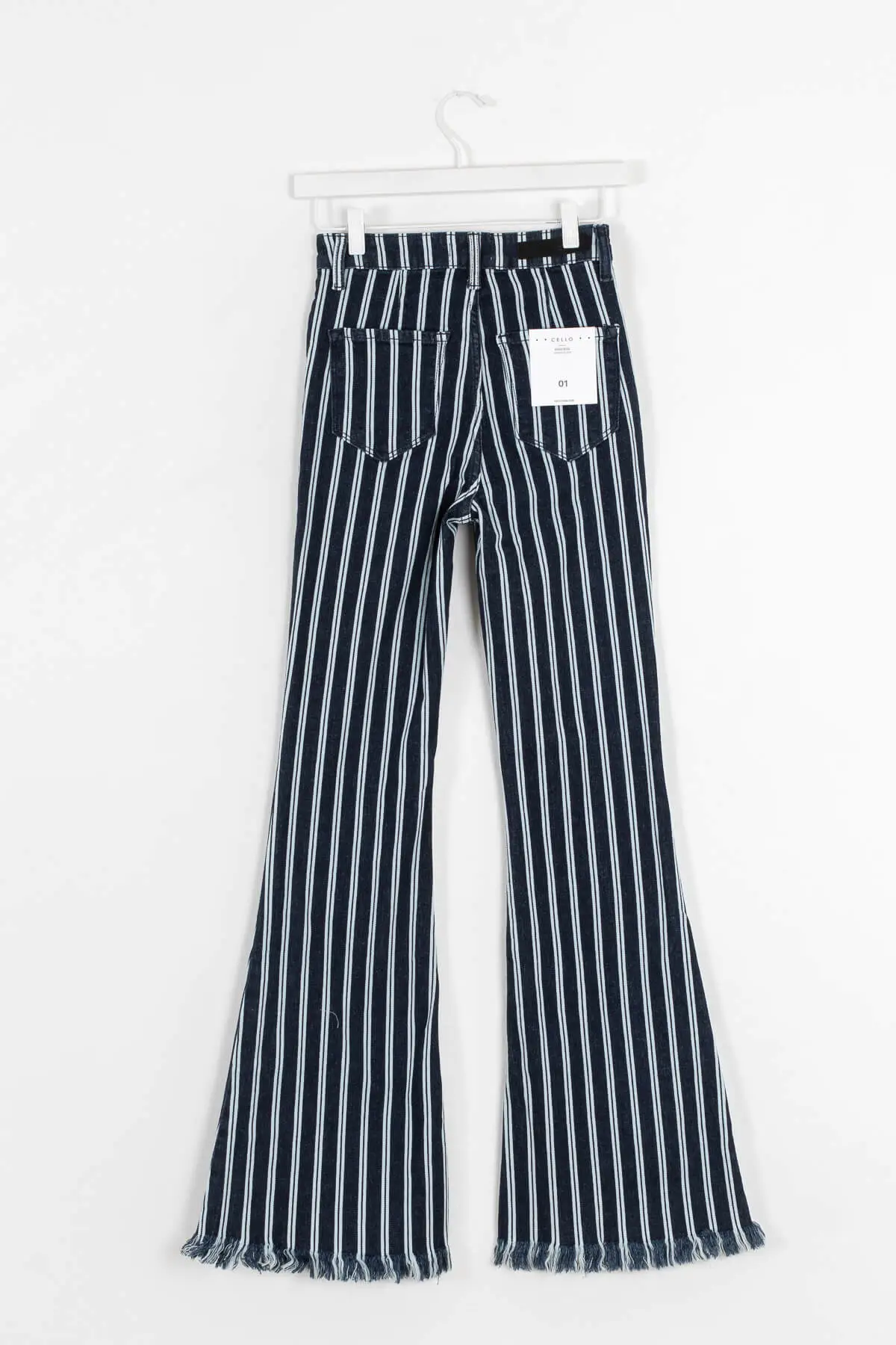 Wear stripes to be spotted in the Stripe Out Flare Jeans by Cello. These high waisted flare jeans feature a cool white on dark denim stripe pattern and raw edge hems. Pair these with your favorite graphic tee for ultimate cool girl style.