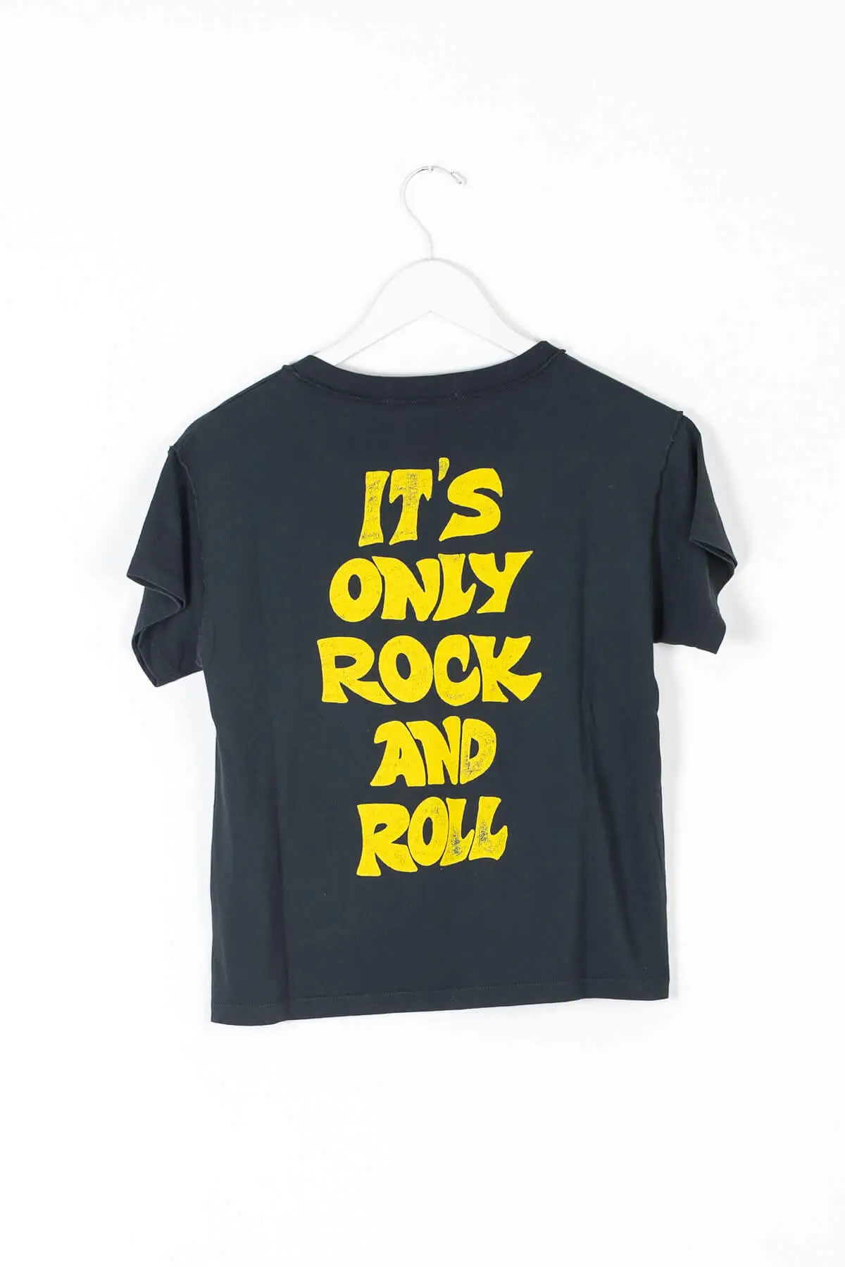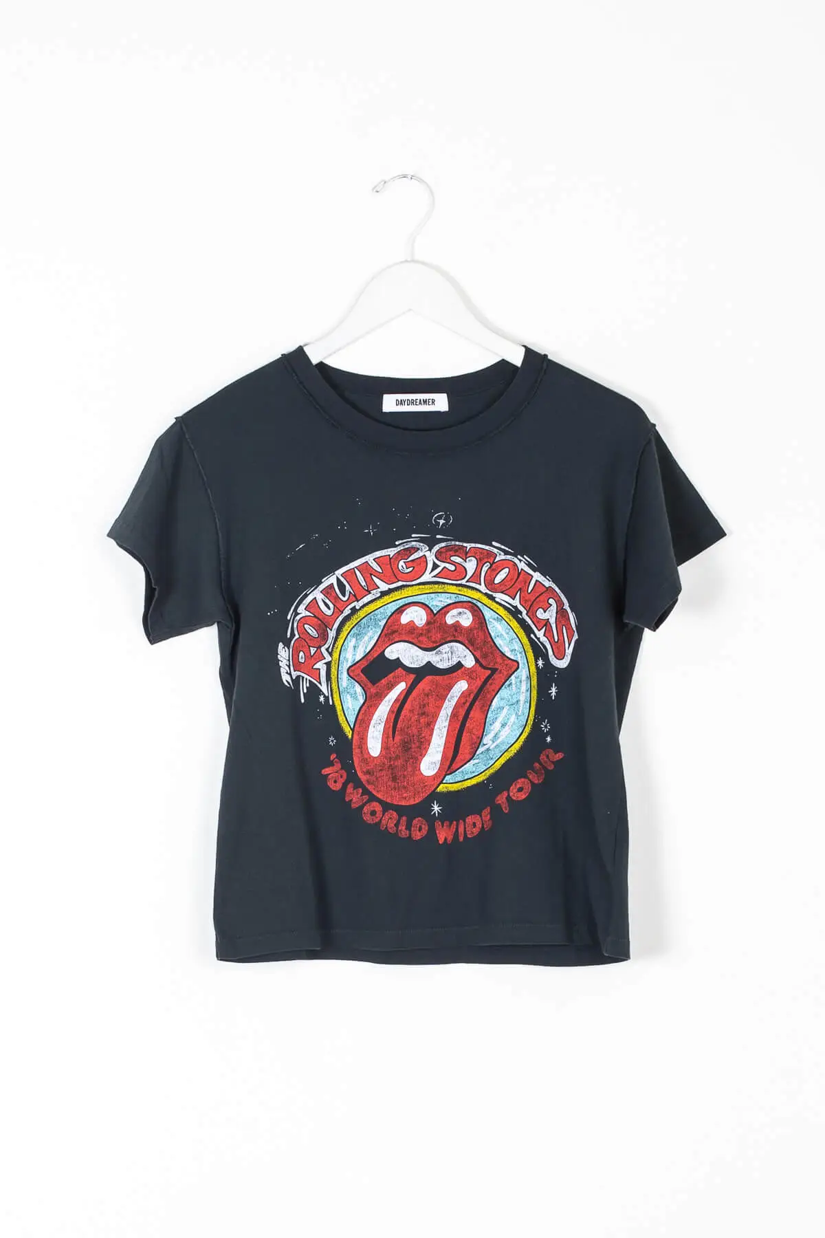 This reversed girlfriend tee by Daydreamer is a nod to The Rolling Stone’s legendary lips logo and their ‘78 tour. It features ladder stitch on all hems with shorter sleeves and a slightly cropped length.