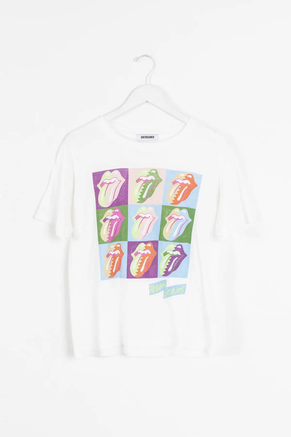 Get what you want in our Rolling Stones 9 Licks Boyfriend Tee, by Daydreamer. Featuring a white colored oversized tee silhouette with the iconic Rolling Stones tongue graphic on the front. Style half tucked with flare jeans and your fav booties to complete this rad look. Perfect for casual outings with friends, running errands and lounging around the house.