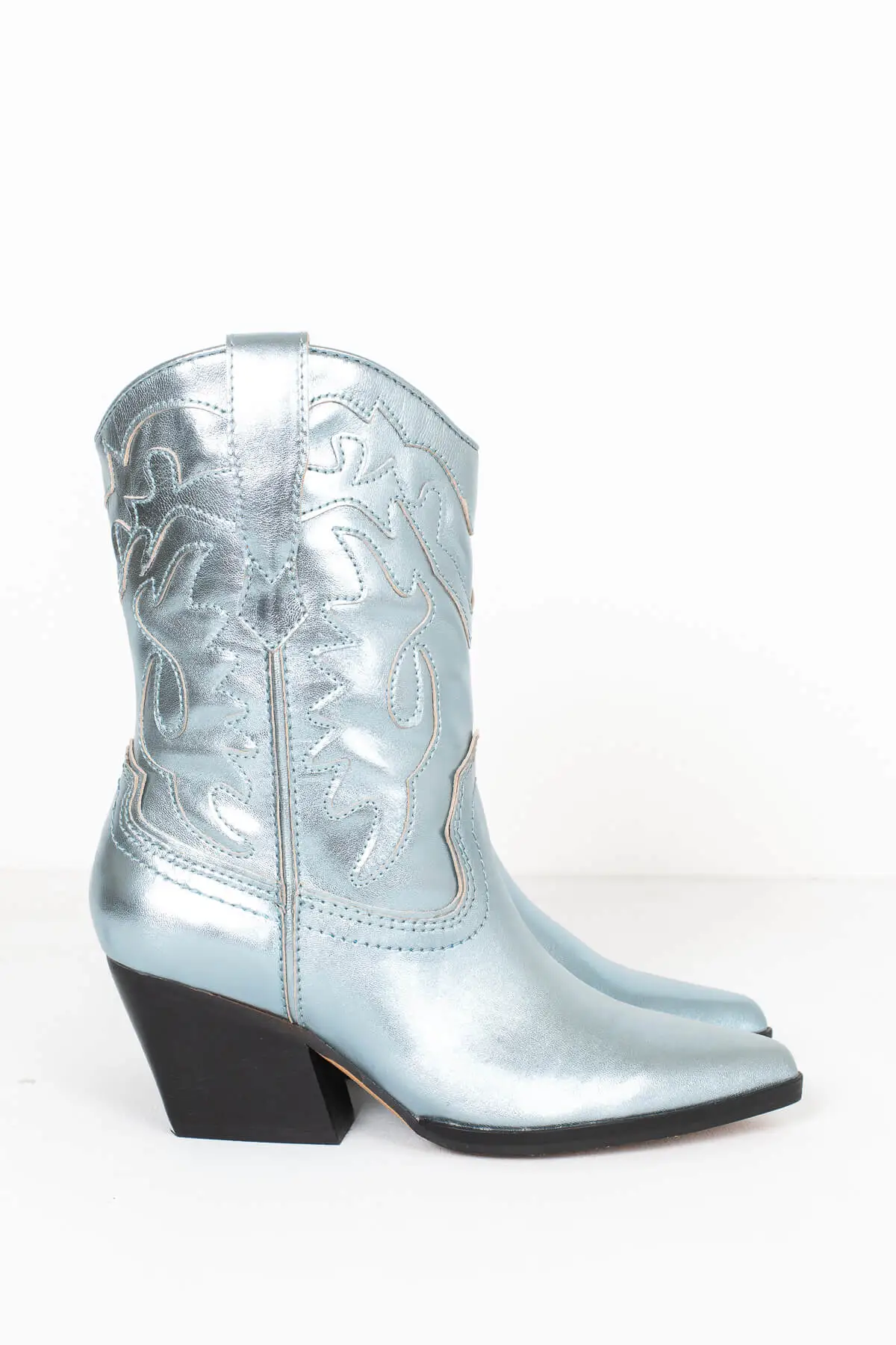 Turn heads in our Landen Cowboy Boots. Featuring a metallic blue cowgirl boot with western inspired details and a black 2.5 inch heel. Style with a dress or flare jeans to complete this chic western style. Perfect for going out with friends, running errands and wearing to music festivals.