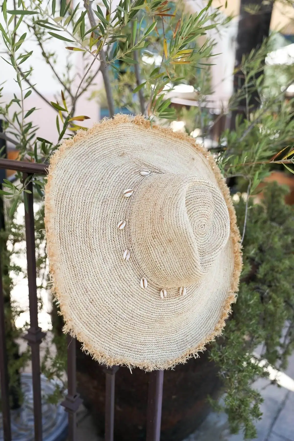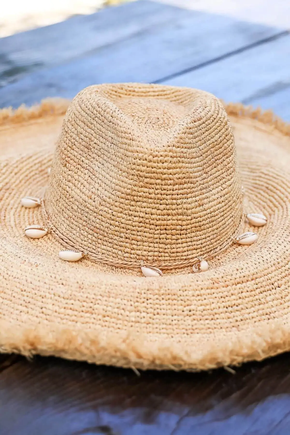 Extra wide brim raffia sun hat with braided raffia and shell hat band.