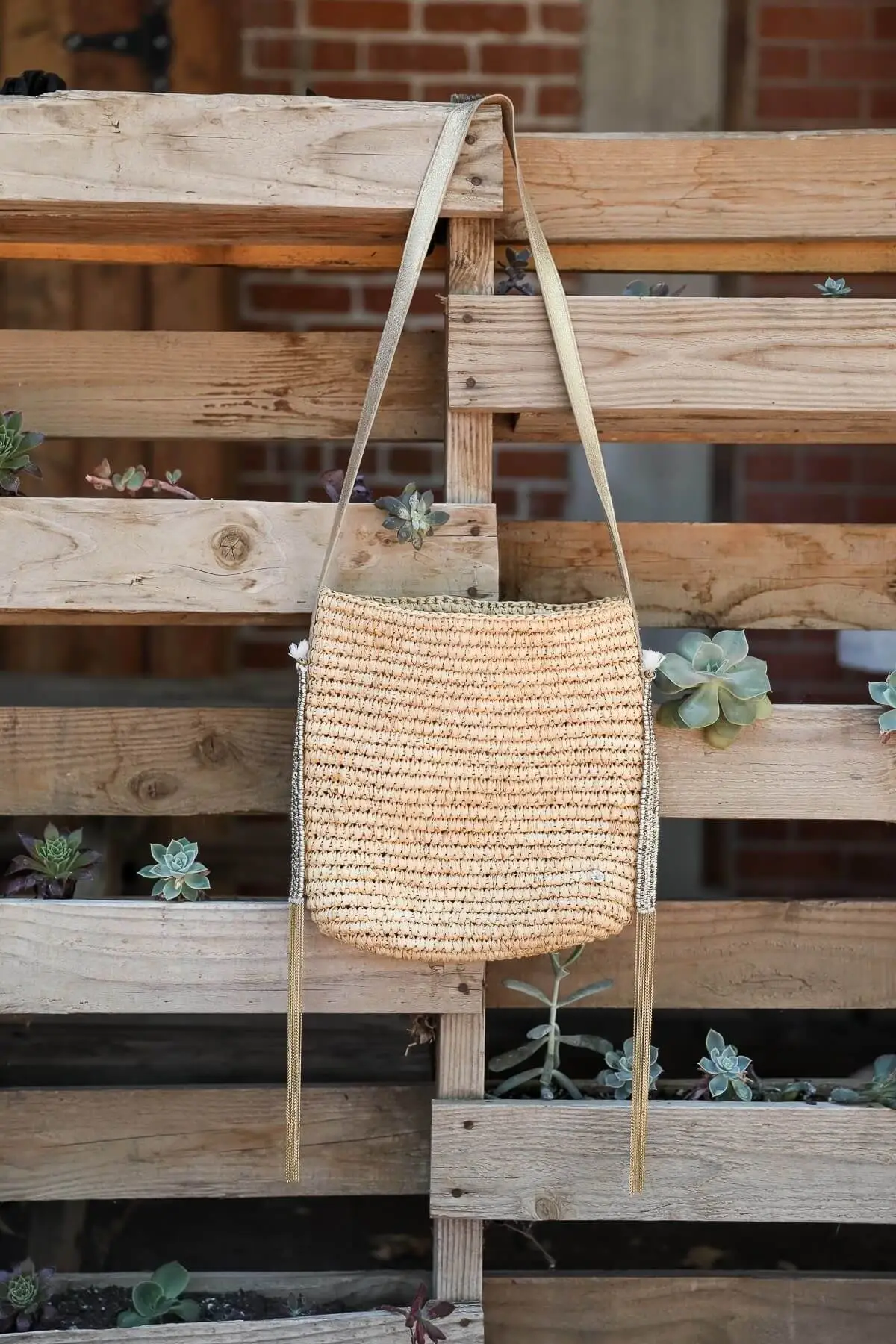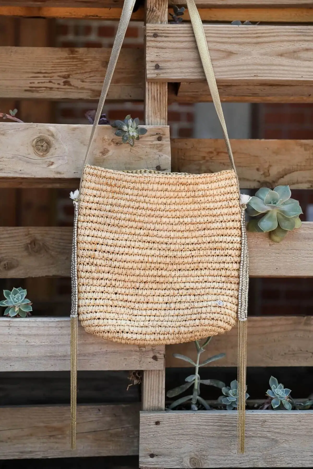 Add some bohemian sparkle to your wardrobe with the Crochet Raffia Leather Tote. Featuring a raffia woven material with metallic threading for an extra sparkle, side gold fringe and a gold strap. Style with your favorite maxi dress to complete this boho chic look.