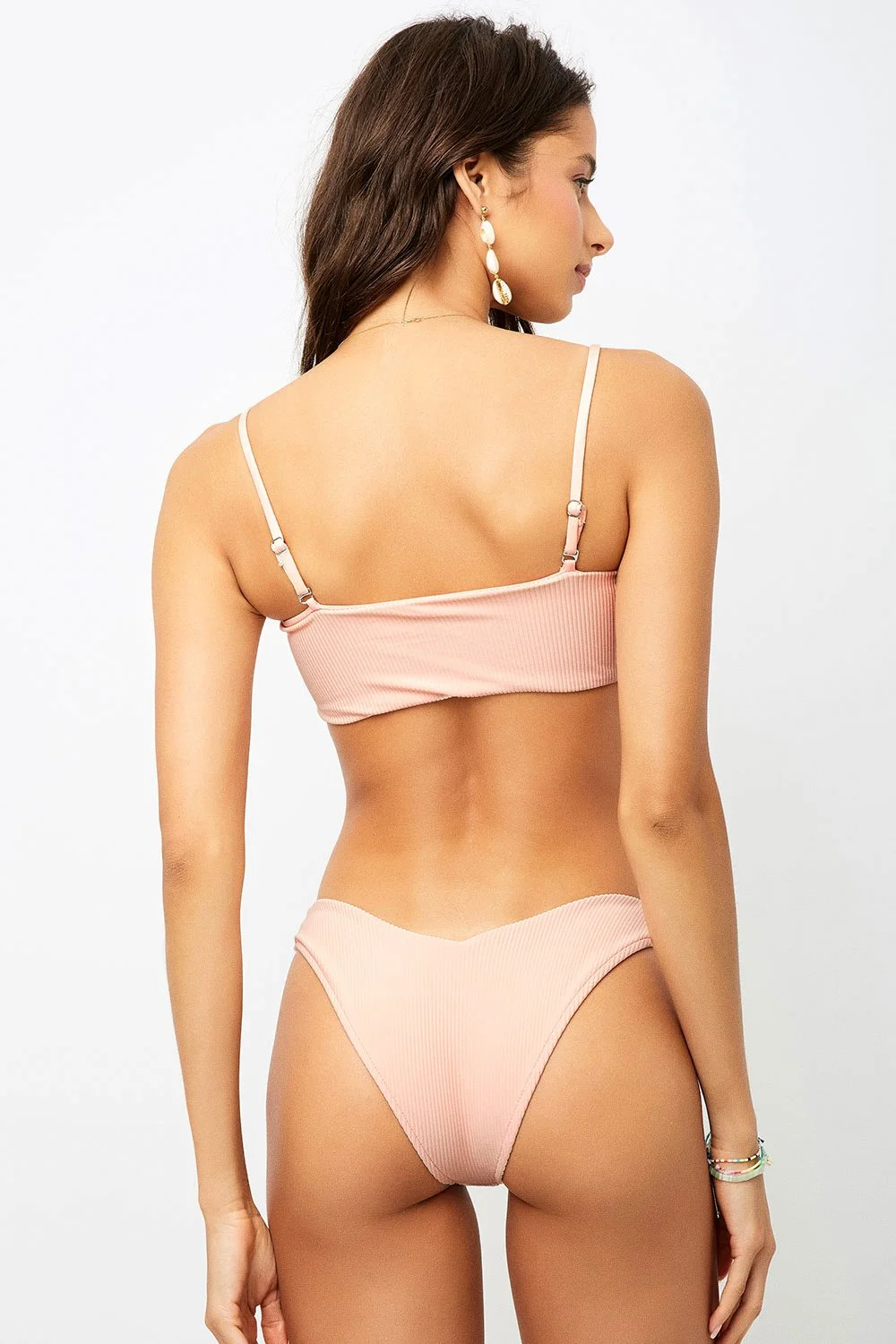 The Enzo bottom from Frankie’s Bikinis has a V-shape and high leg cut in a ribbed fabric.