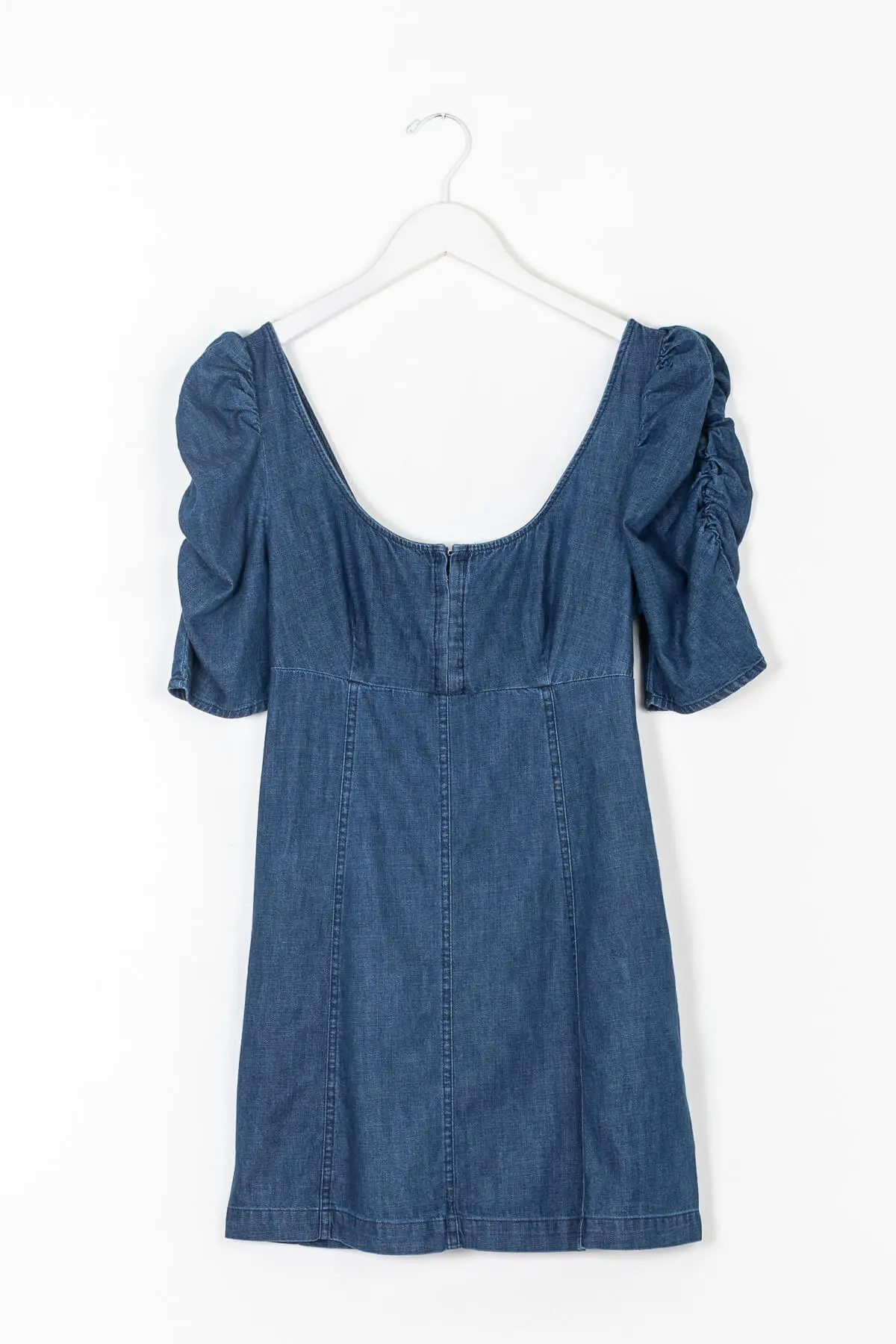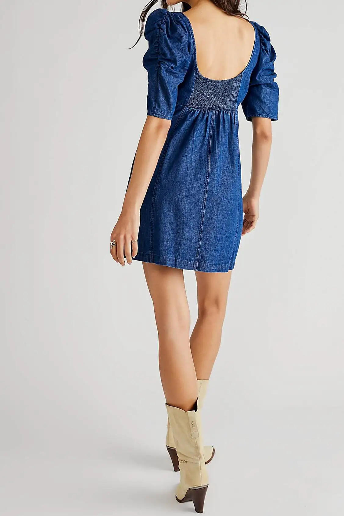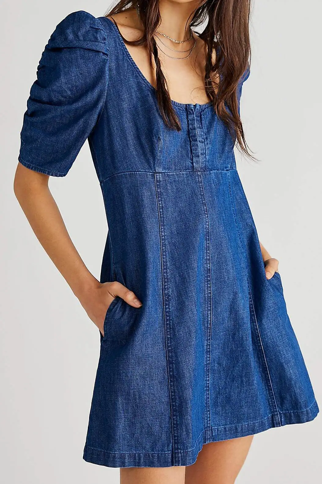 The Cheyenne Denim Mini Dress by Free People features a classic silhouette with puffed sleeves and defined seaming throughout for added dimension.