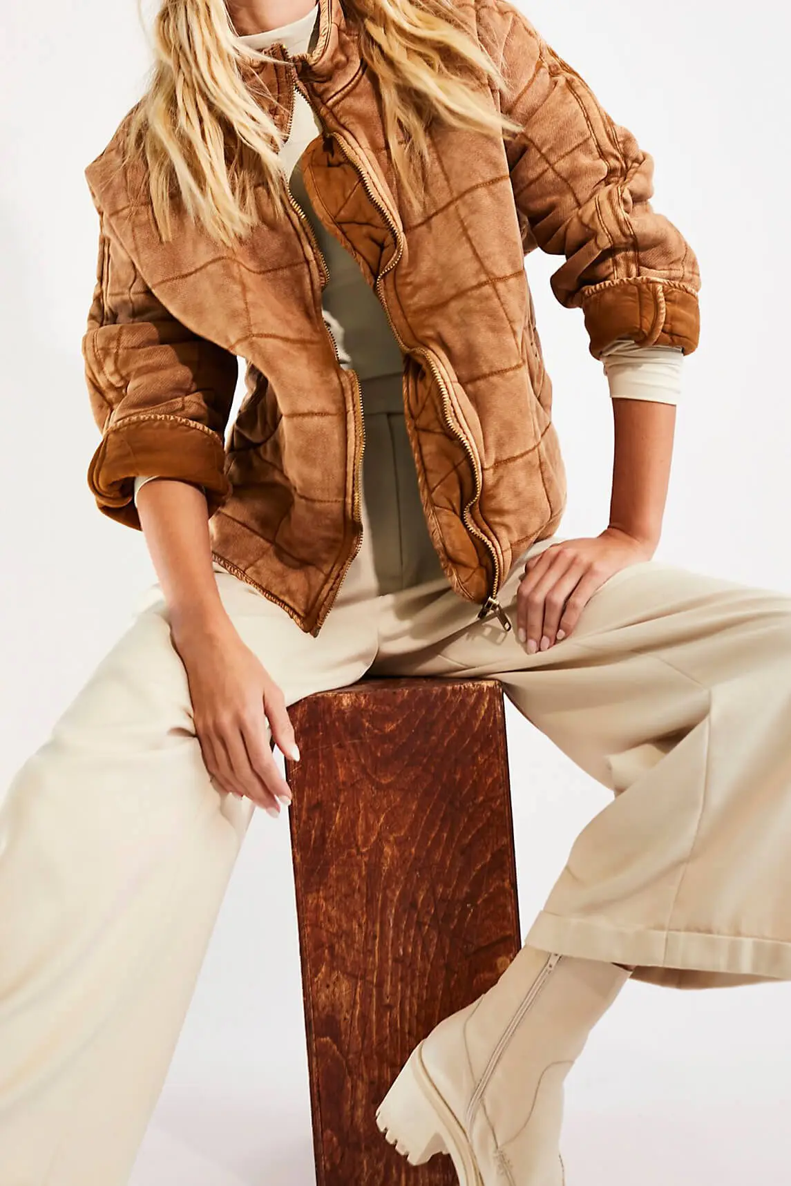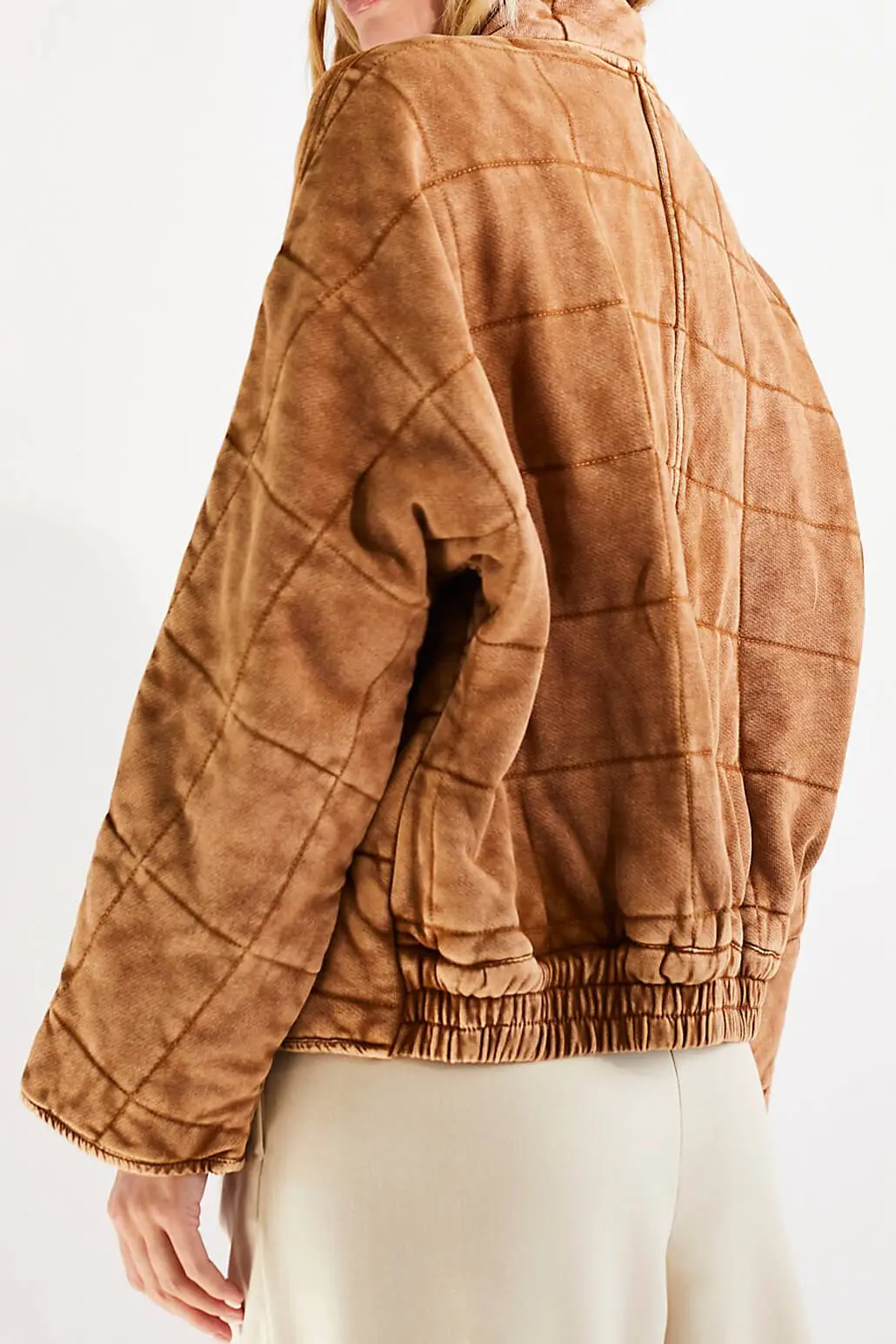 Meet everyone’s favorite jacket – the Dolman Quilted Knit Jacket by Free People. It features a slouchy and oversized fit in a soft, quilted knit fabric with a zip-front closure, funnel neckline, and cinched back hem.