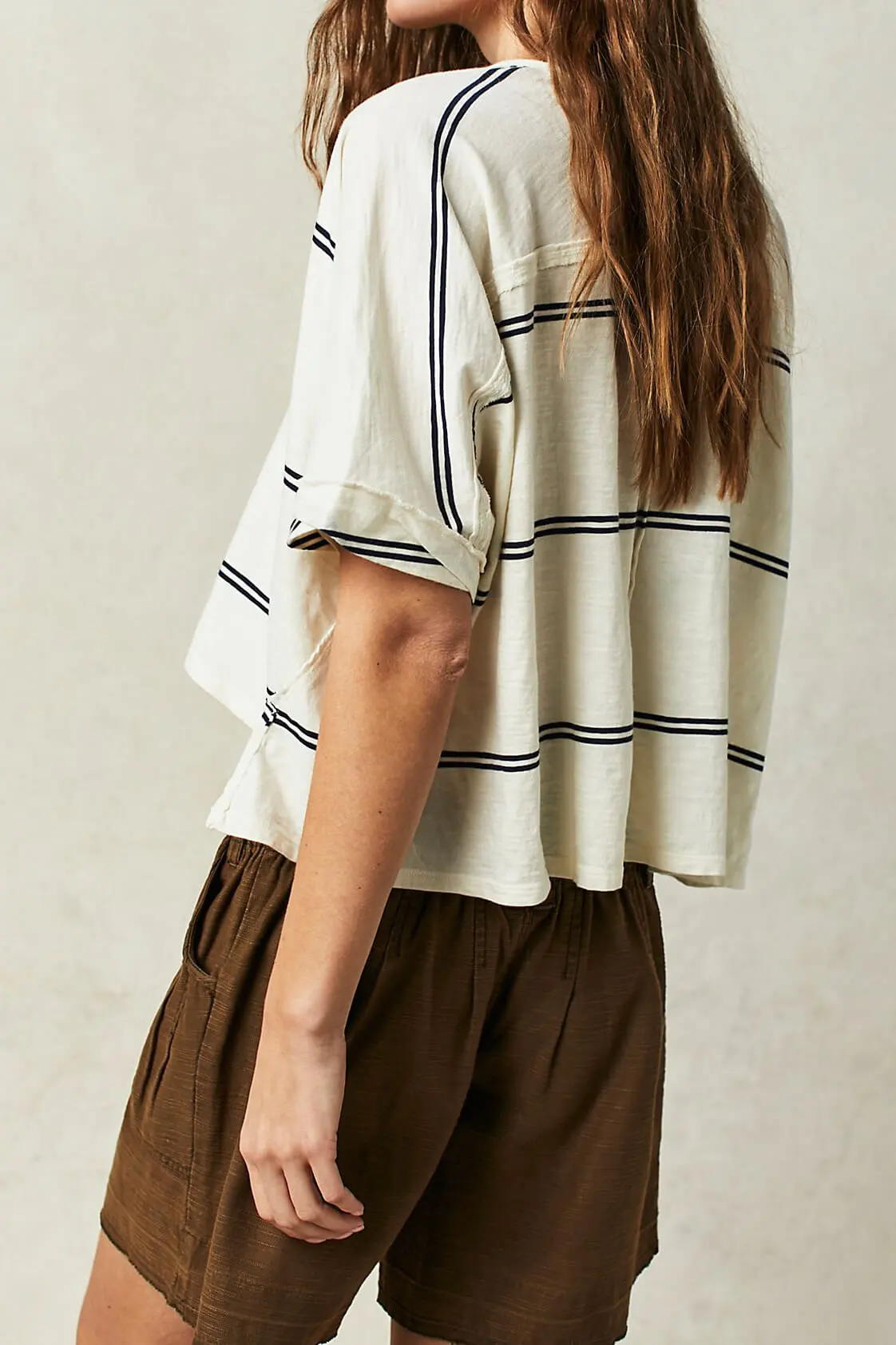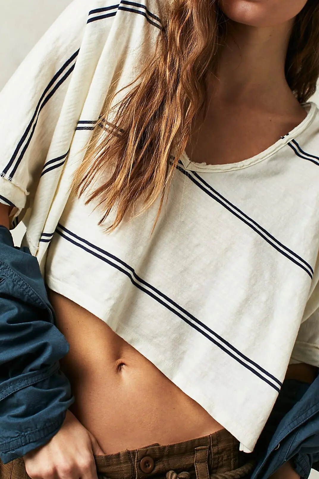 The Jaydon Stripe Tee by Free People has a boxy, cropped silhouette, cuffed sleeves, and a classic stripe pattern.