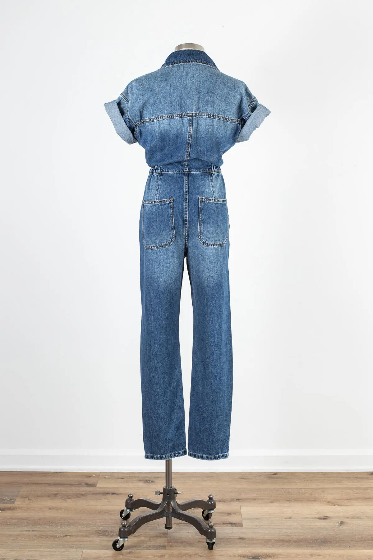 Feel casual and comfortable in our Marci Jumpsuit. Featuring a dark blue denim material with a straight leg silhouette, silver accent buttons, an elastic waist and six pockets. Style with your favorite booties to complete this casual look. Perfect for running errands, a casual day at the office, going to the farmers market and traveling.
