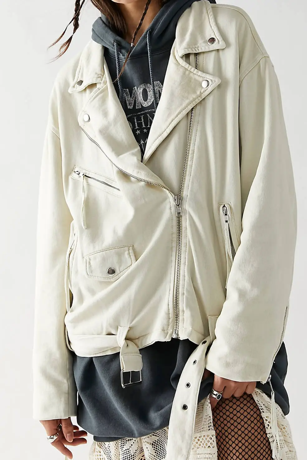 Stay warm in our Rebel Rebel Knit Moto Jacket by Free People. Featuring a thick knit material with three pockets, bronze accent sleeve zippers, a front bronze zipper and buckle for the perfect fit. Style in layers with a crop top and high rise jeans to complete this effortlessly chic Fall look. Perfect for colder nights out with friends, running errands and traveling.