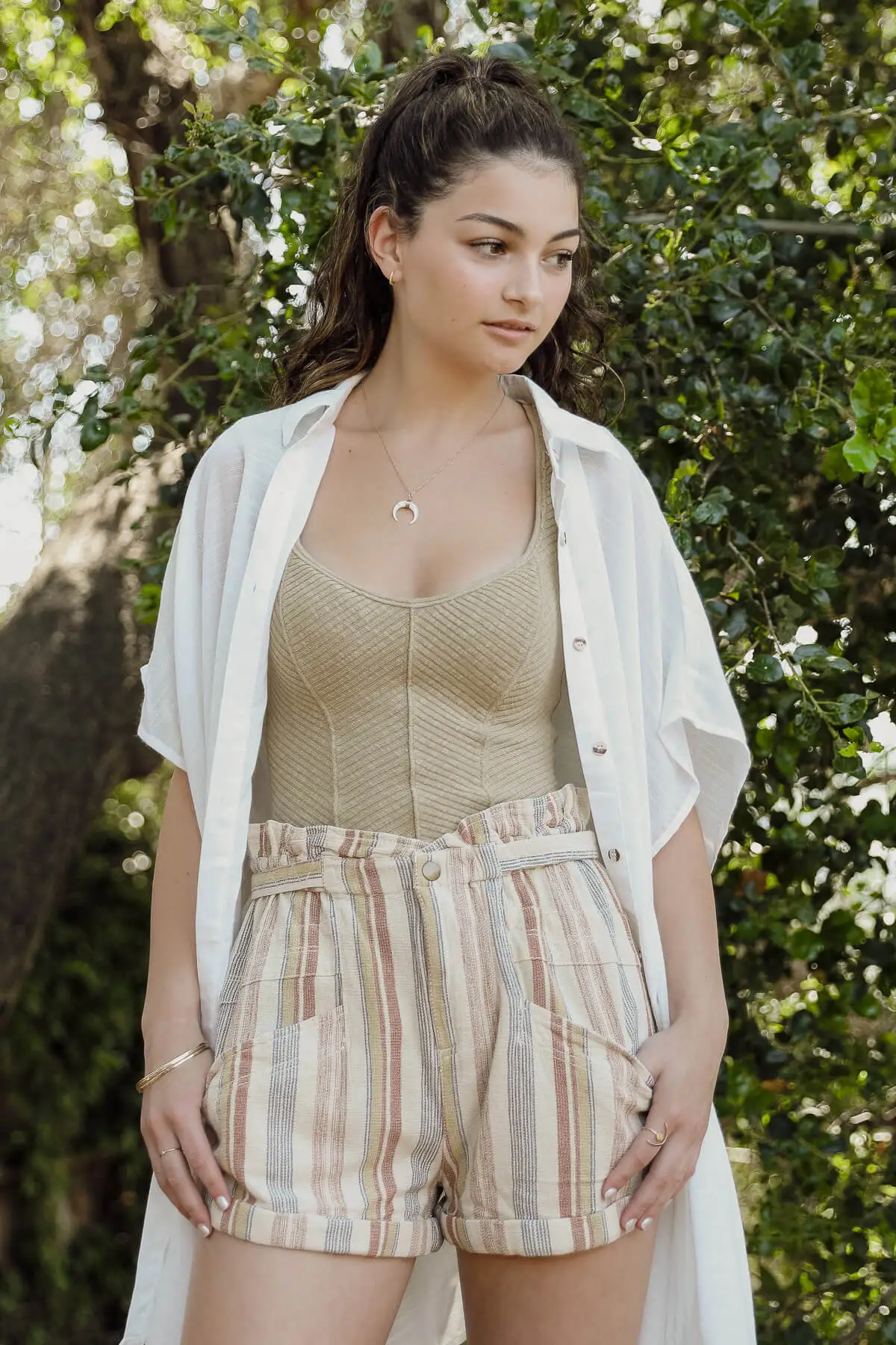The Topanga Shorts you know & love in a yarn dyed stripe fabric. These summer staples by Free People are your go to, wear with everything, dress up or down paperbag shorts. They’re sure to be your #1 all season long.