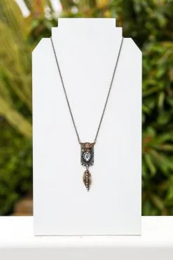 Mikal Winn Brass Dog Tag Owl Leaf Drop Necklace