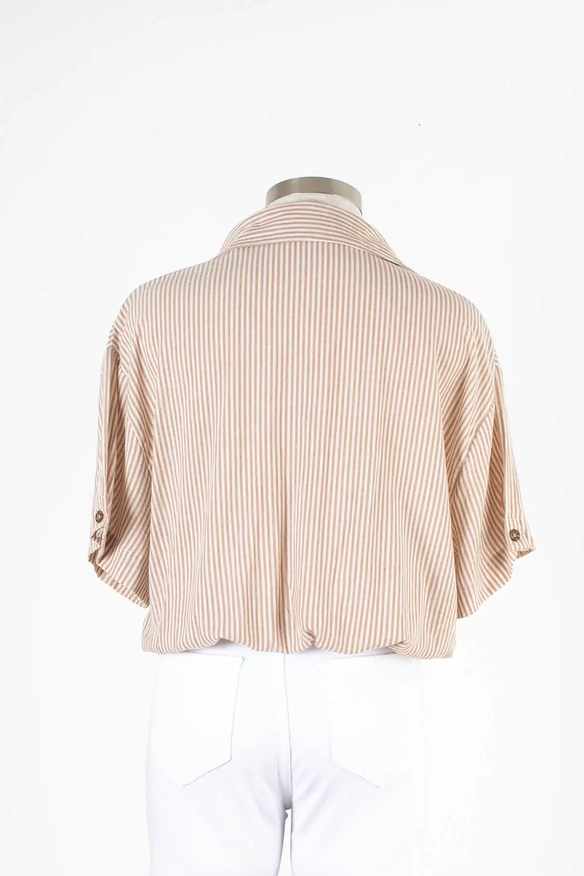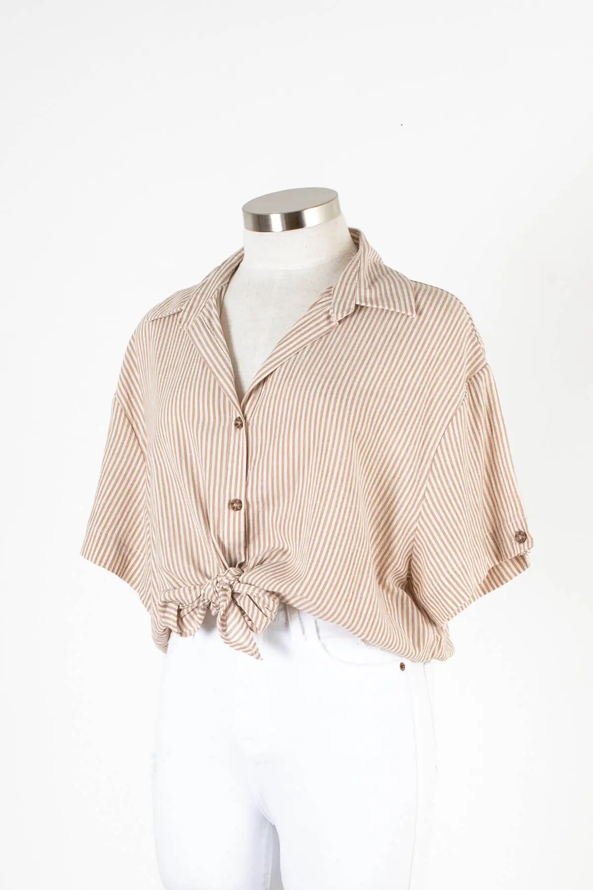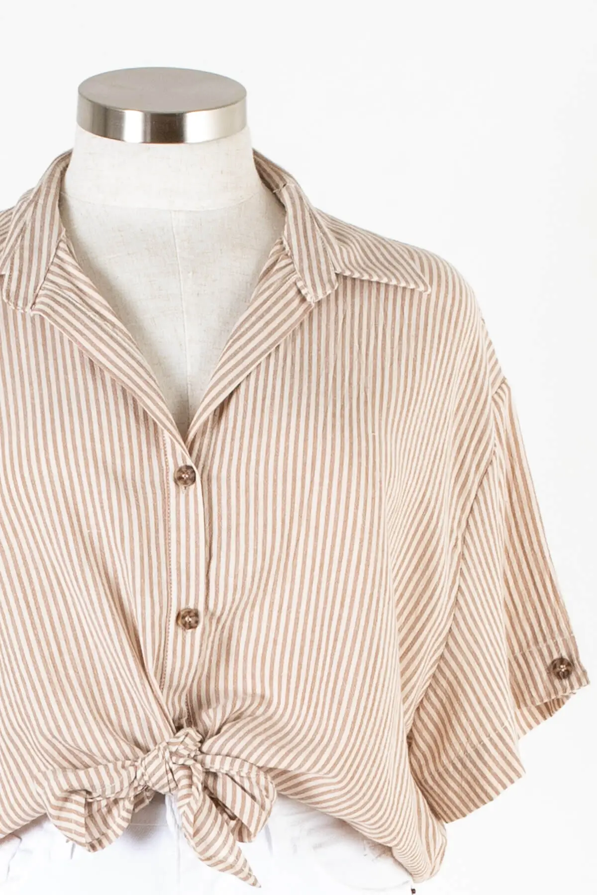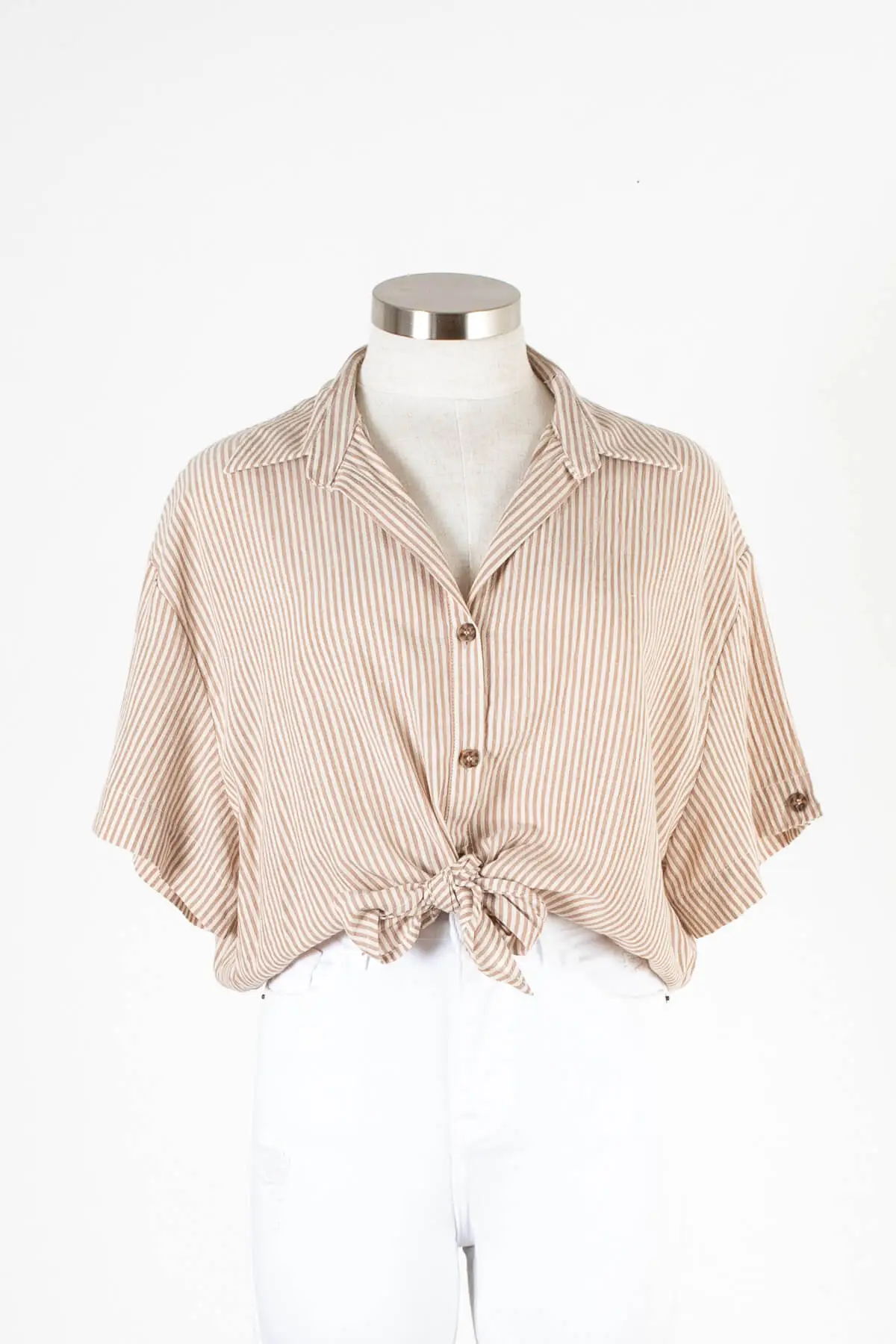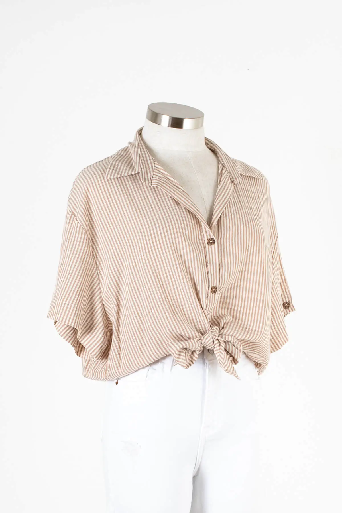 Go casual in our Drop A Line Crop Top. Featuring a loose-fitting t-shirt silhouette with brown stripes, an adjustable front tie with three buttons. Style with high rise flare jeans and sandals to complete this casual summer look. Perfect for brunch with friends, running errands, and vacation.