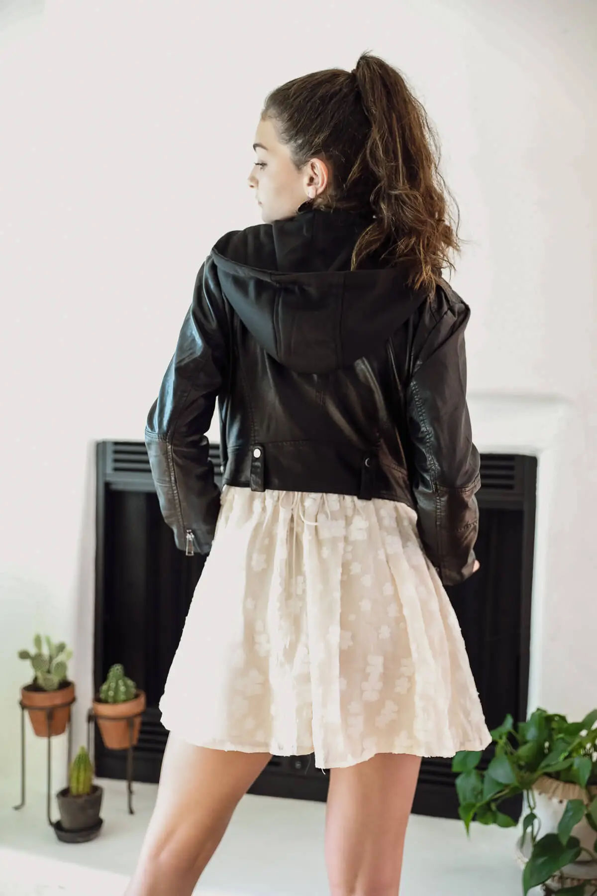 This cropped vegan leather jacket is perfect over dresses. Cuts at just the right spot to not add bulk.