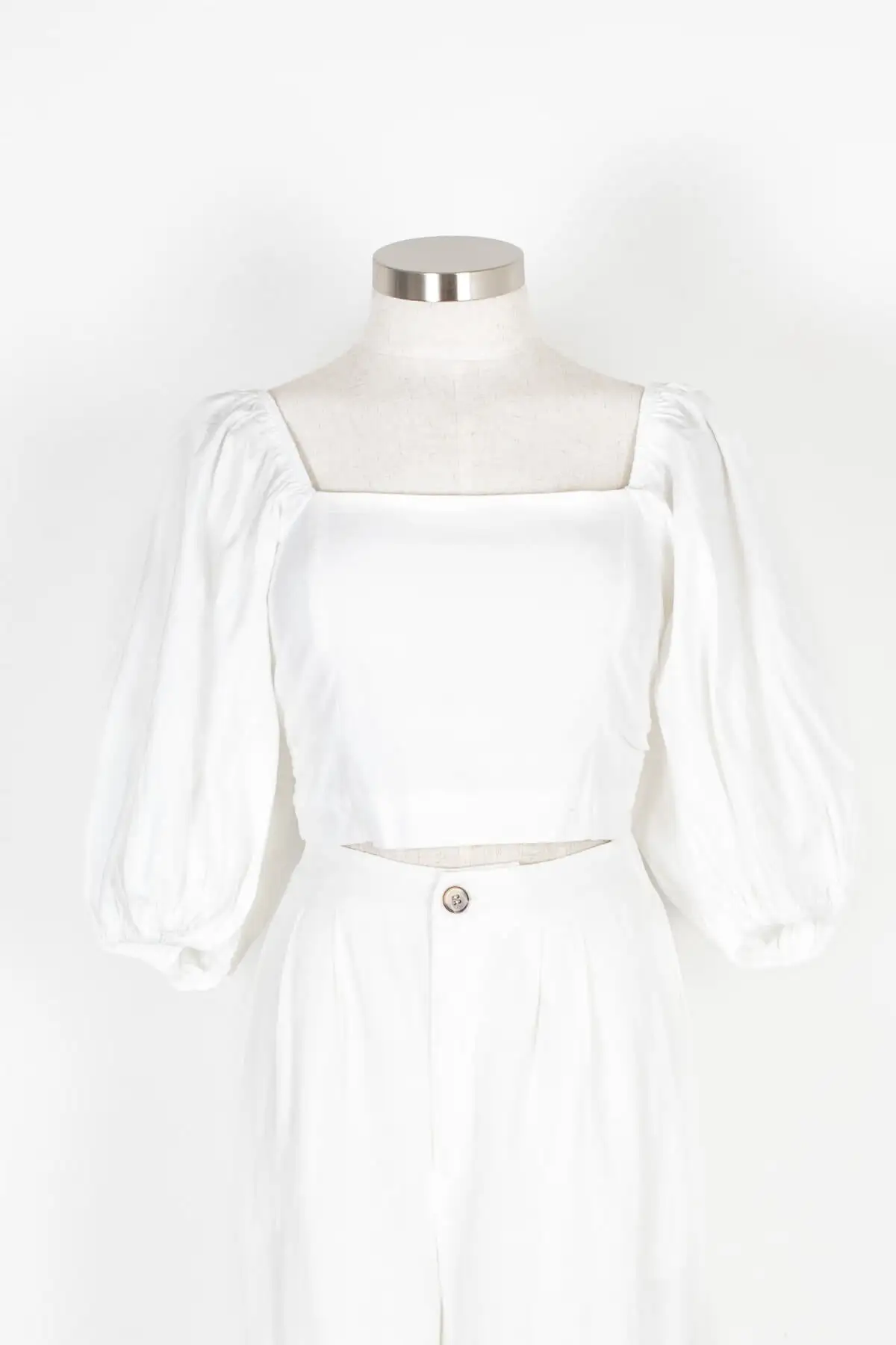 Embrace your femininity with our Lilith Top. Featuring a cropped silhouette with a square neckline, puff sleeves and a back tie for the perfect fit. Style with high rise flare jeans or a maxi skirt to complete this flirty summer look. Perfect for summer parties, brunch with friends and date night.