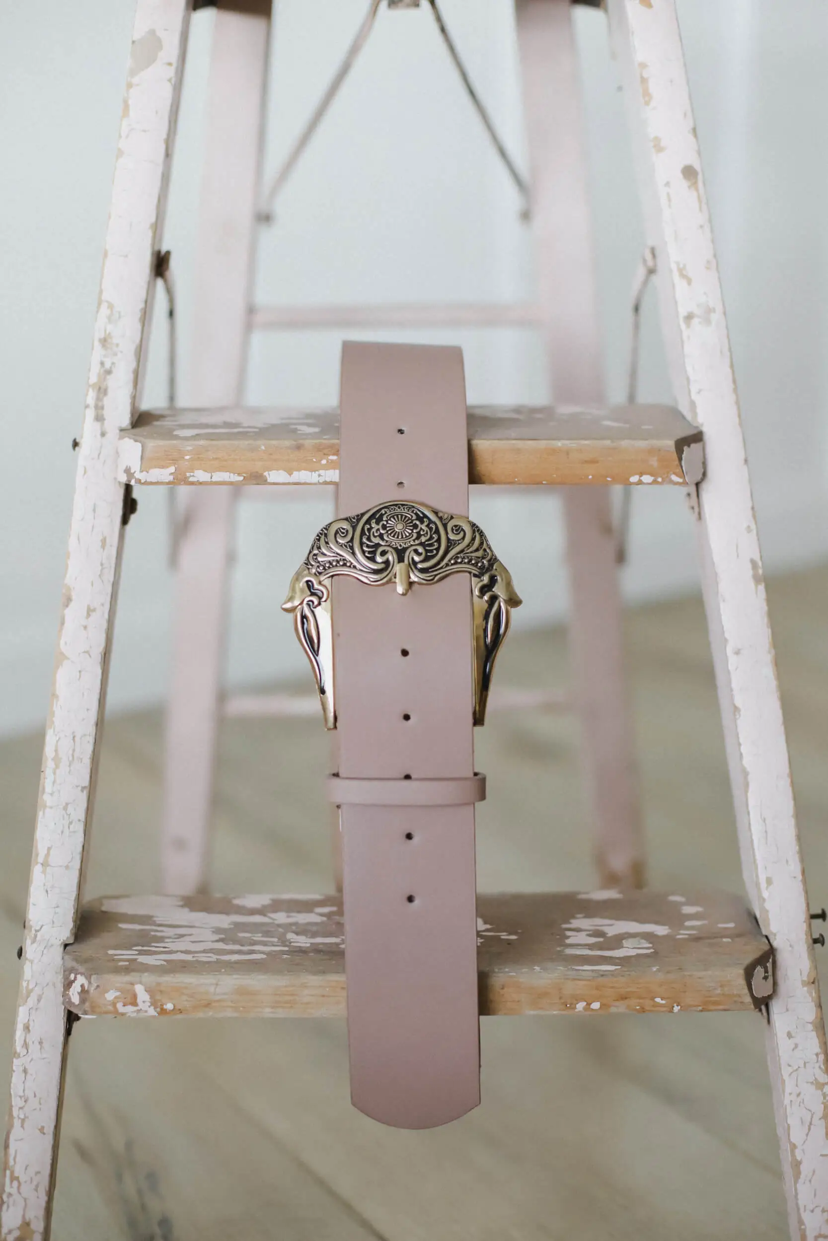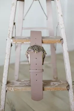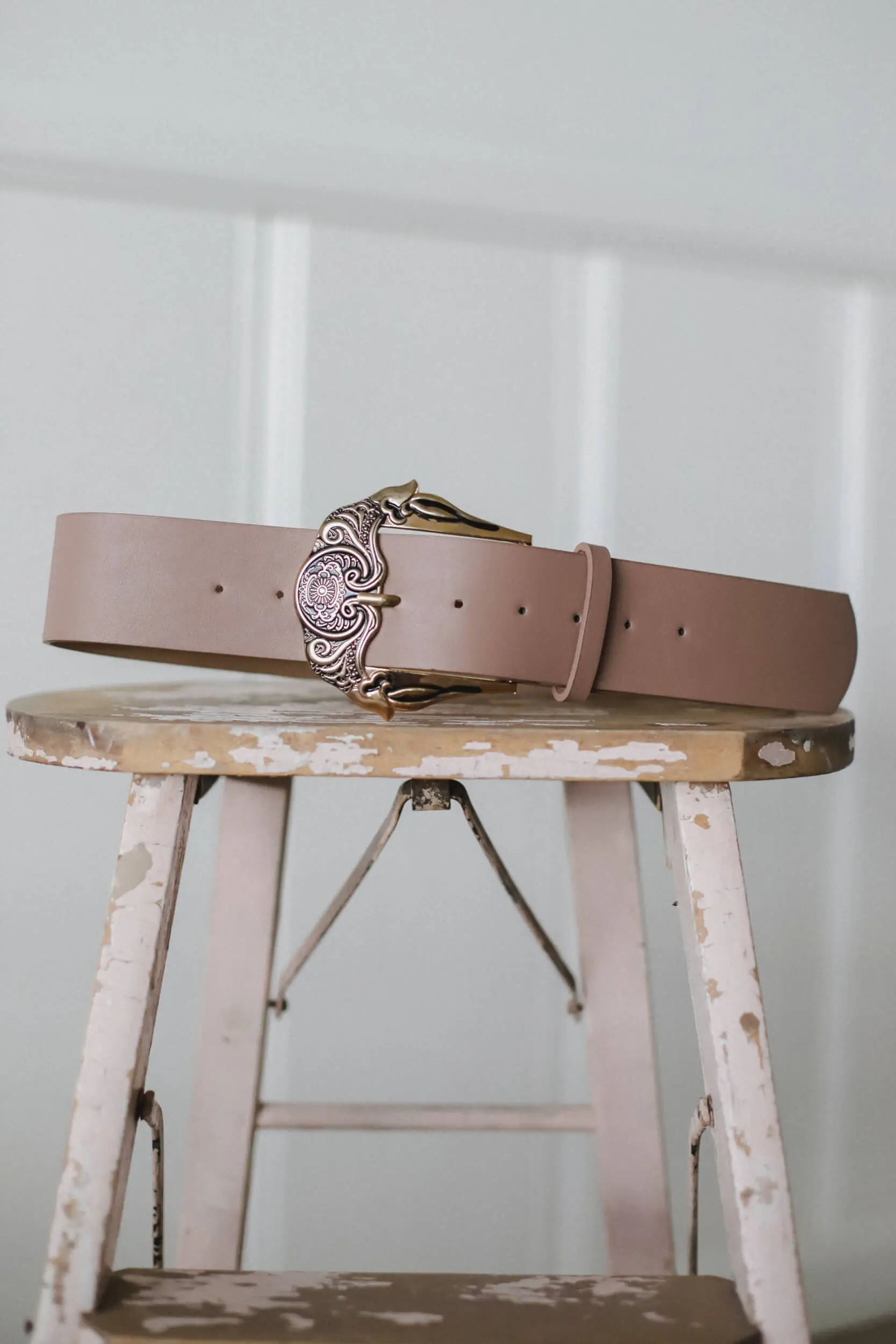 This warm toned belt features a mix of vegan leather with an antiqued gold belt buckle.
