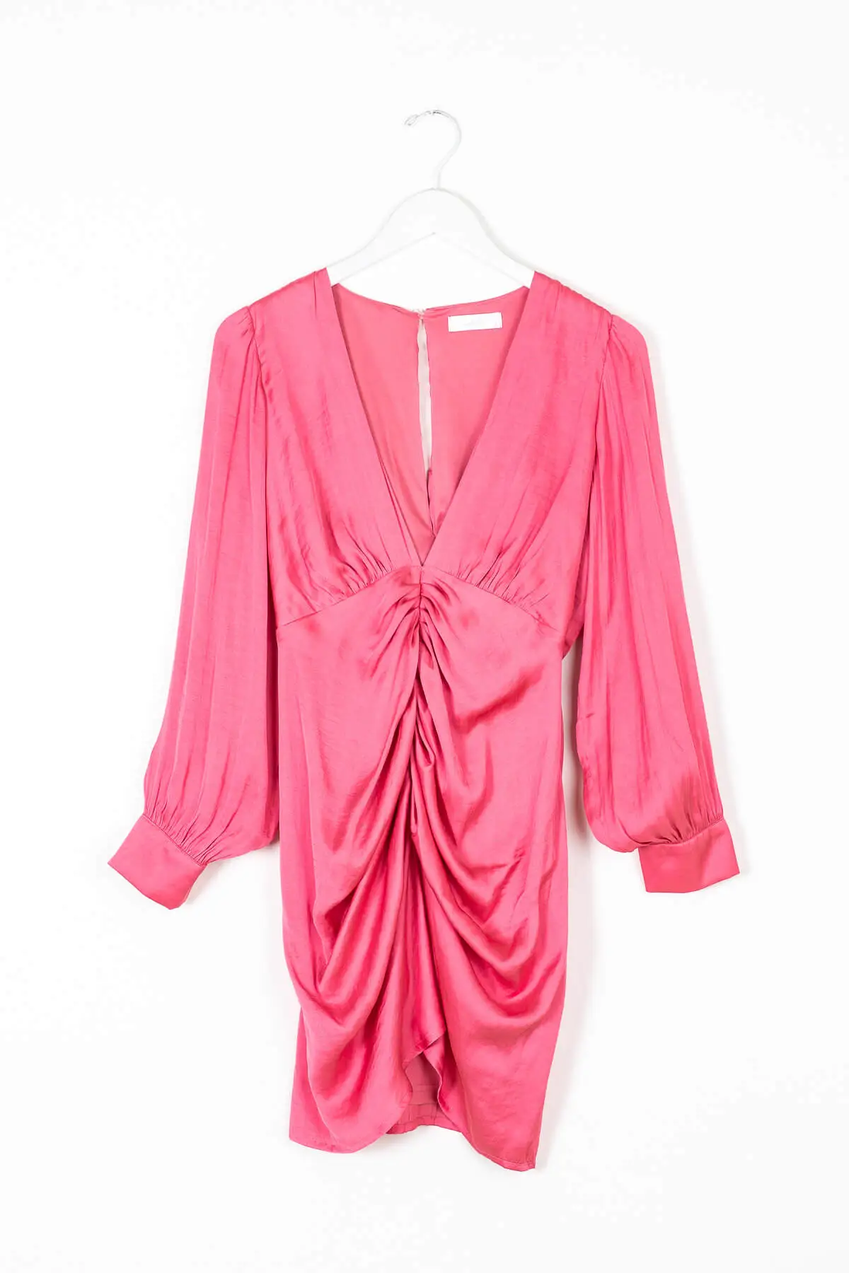 You’ll look pretty in pink in the Mamie Mini Dress by Kariella! This satin mini dress features a deep V neckline, keyhole opening in the back, ruched skirt bottom, and button cuffs on the sleeves. Perfect for a variety of celebratory occasions, you’re sure to love this piece for years to come.