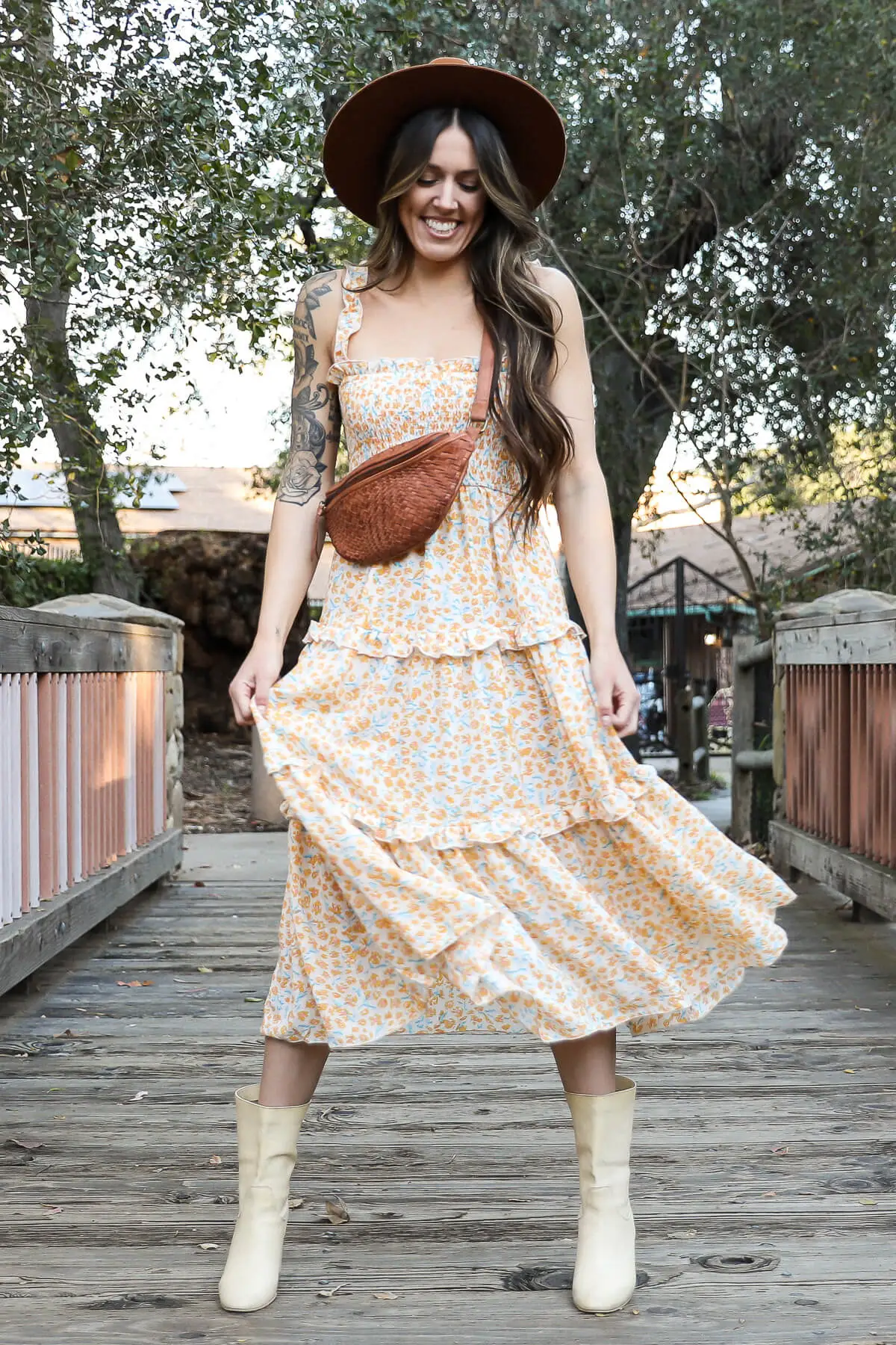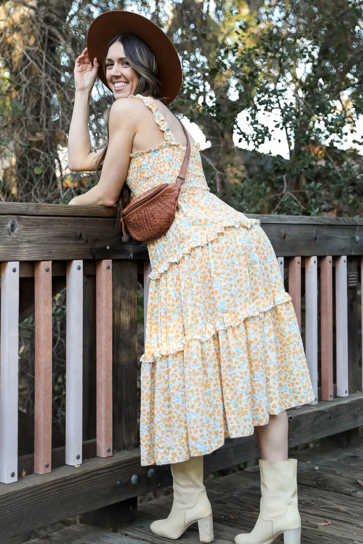 Tiered floral print midi dress by Kariella featuring a stretch ruched top and stretch ruffled straps.