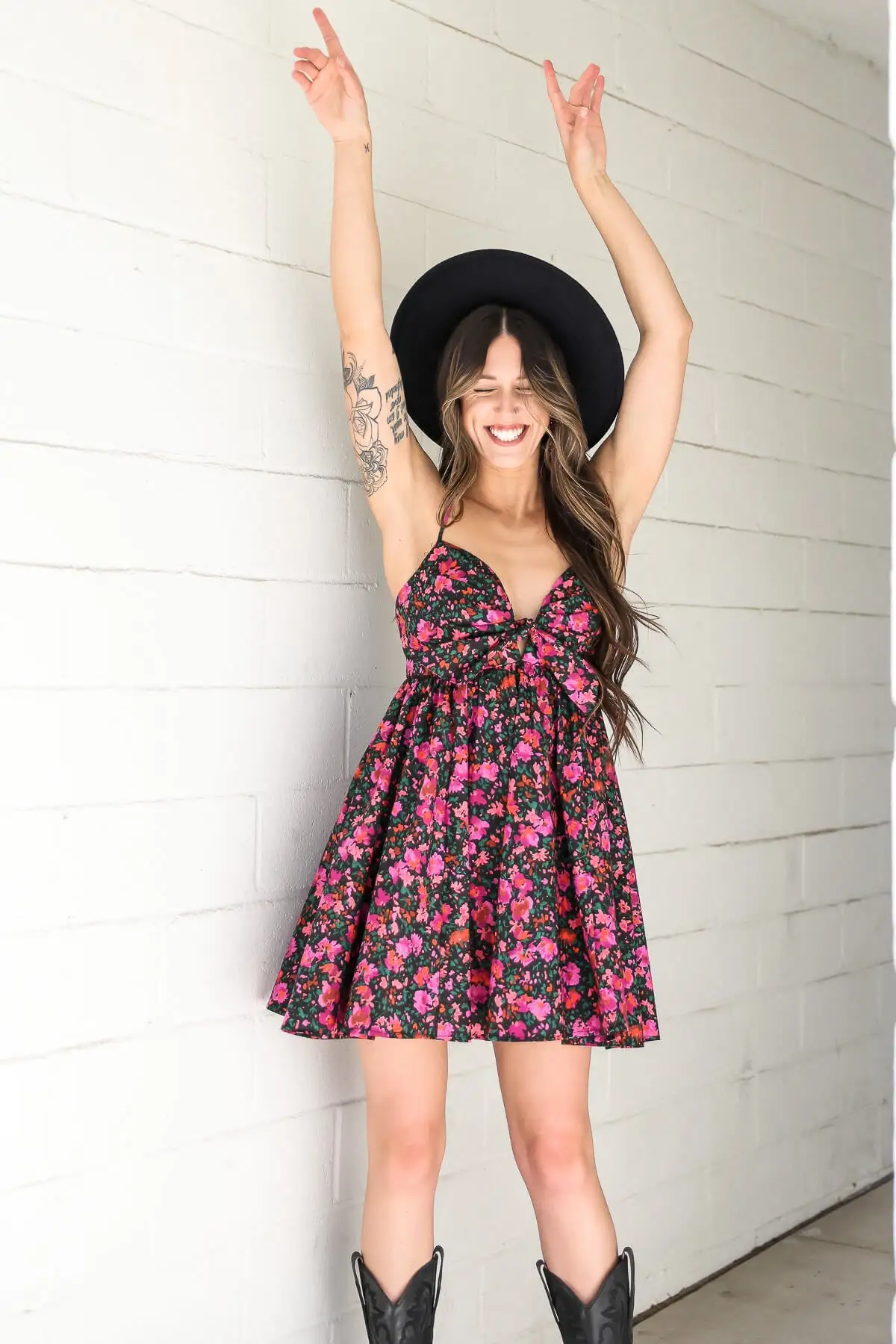 90s throwback floral print mini babydoll dress by Kariella featuring a a tie front, zipper back and adjustable straps.