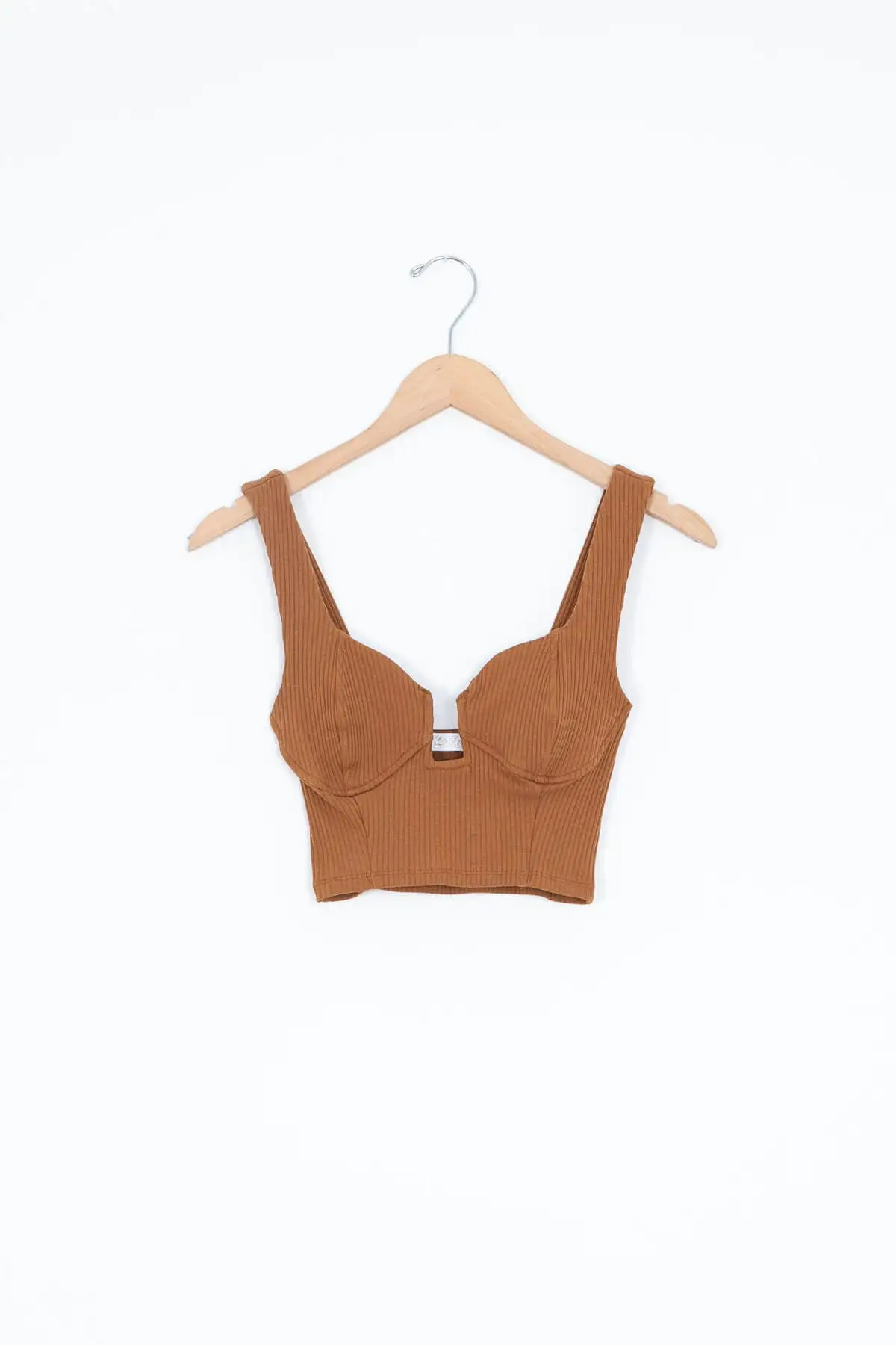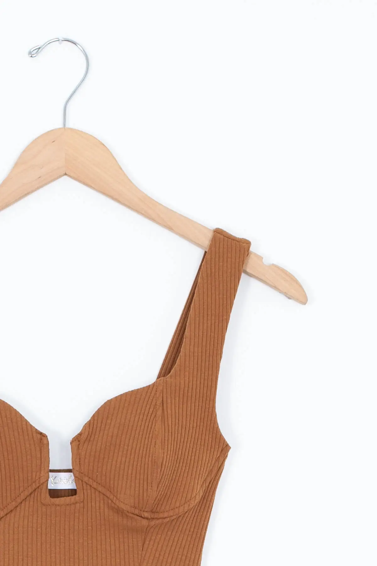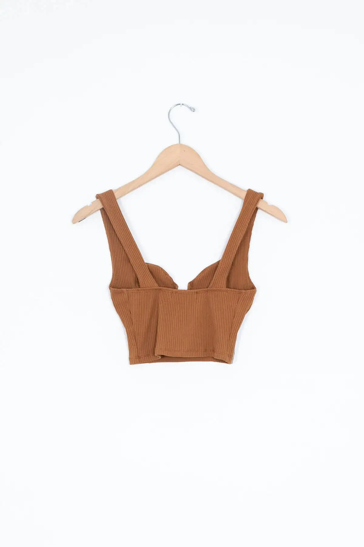 Show off your figure in our ribbed Victoria Crop Tank Top. Featuring an outlined bust design on a brown, soft, ribbed material. Style with a maxi skirt and sandals to complete this sexy summer look. Perfect for summer parties, music festivals and date night.