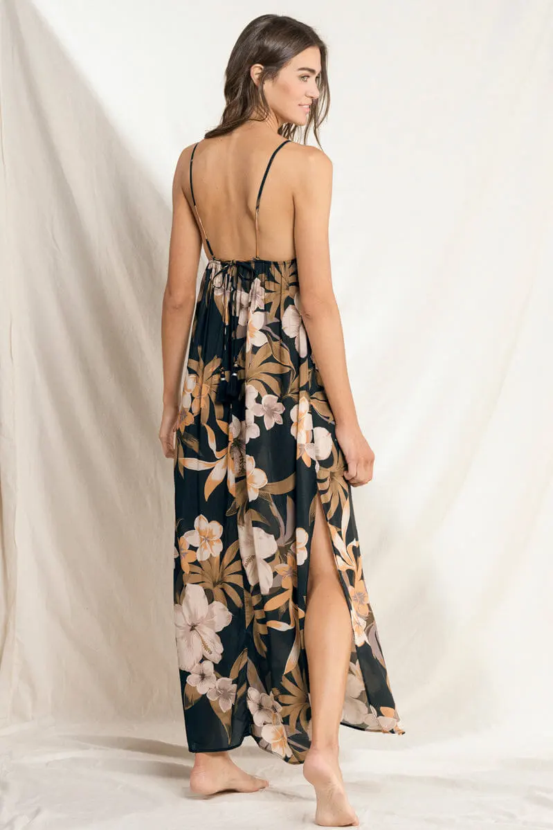 Dream of tropical getaways in the Khaki Long Dress by Maaji. This pull on design features a tropical floral pattern, open sides, and a loose fit.