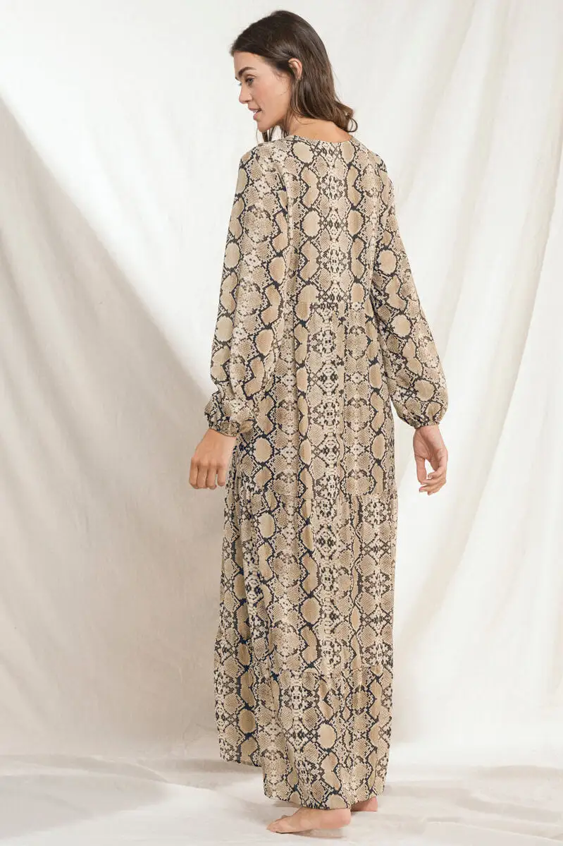 The Luna Long Dress by Maaji is perfect for day to night looks. Pair it with your favorite bikini for the beach or wear it as a maxi. It features a flowy silhouette with puff sleevs, cuffed sleeves, a v neckline, and button down front which can be worn open or closed!