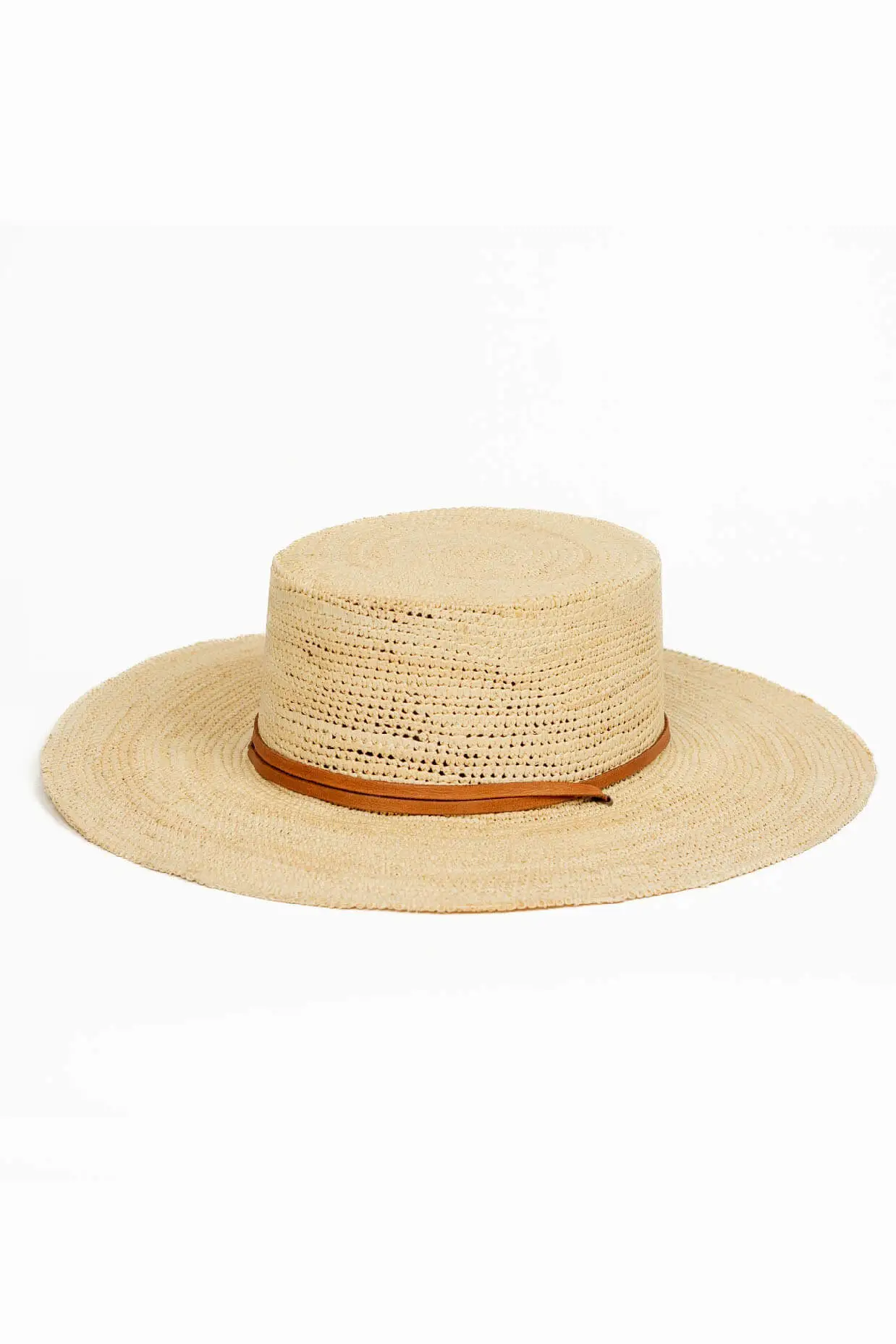 The Straw Boater Hat by Minga is made from natural, toquilla palm straw with a stiff, wide brim.