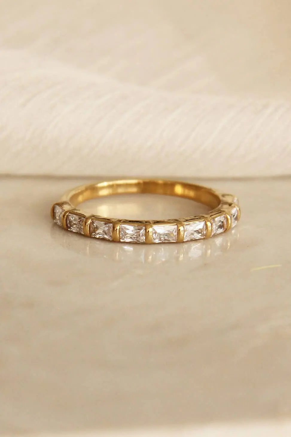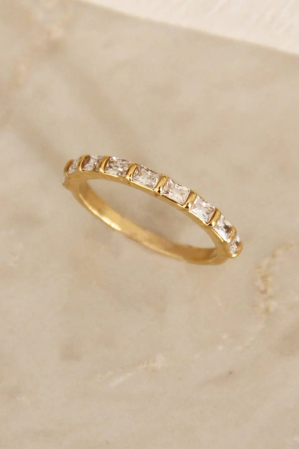 The Baguette Semi Eternity Ring by Maive features a 2mm wide band with 2mm x 3mm CZ stones.