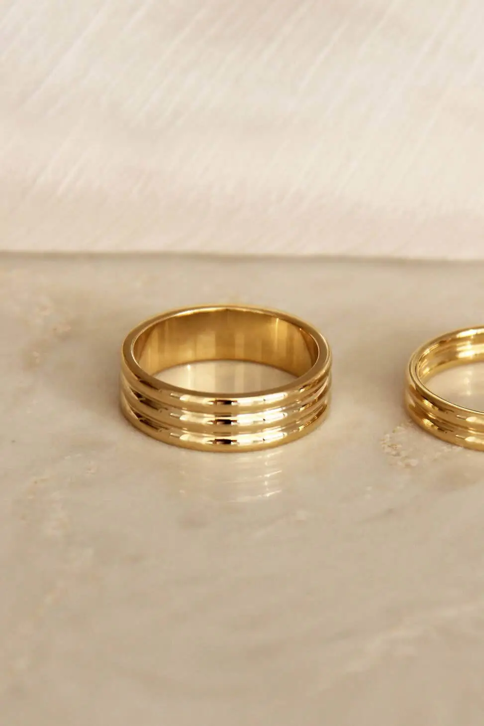 The Layered Cigar Band by Maive features a 6mm wide band made with 18k gold.