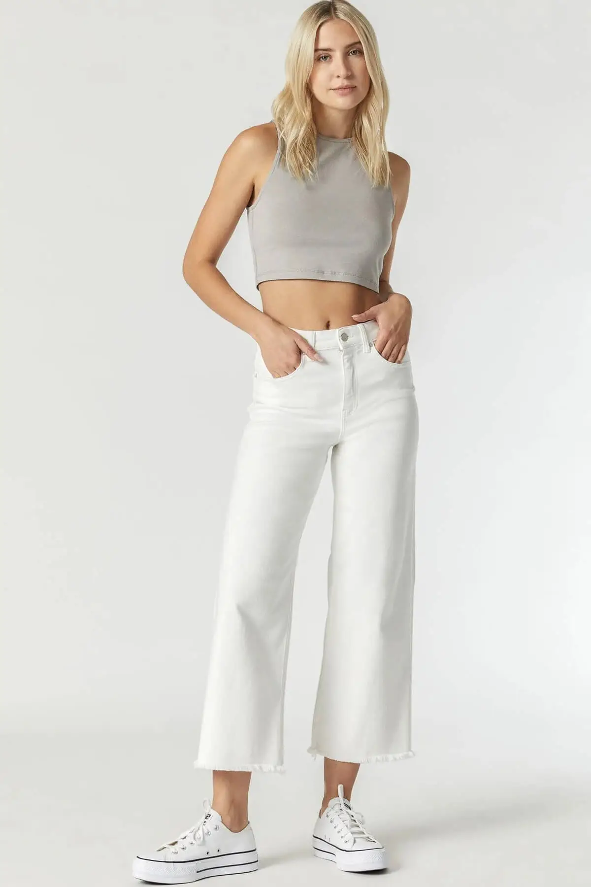 A spring and summer staple by Mavi. These cropped wide leg jeans are slim through the hip and thigh, with a wide leg silhouette and raw hem.