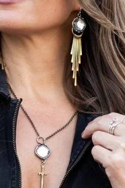 The detail of Mikal Winn’s hand crafted jewelry is one of a kind! This necklace features 3 Swarovski Crystals set in a dog tag design.