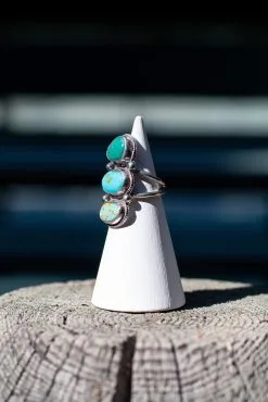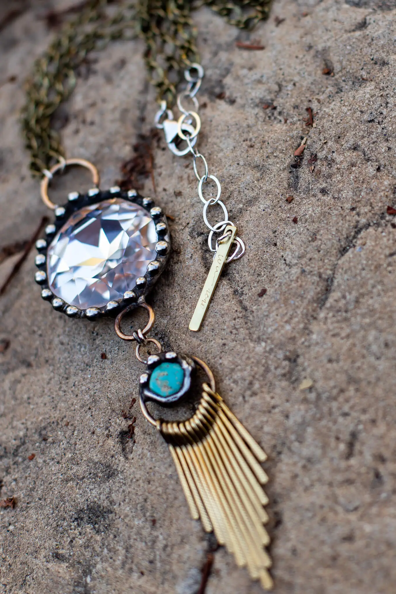 The Crystal Turquoise Necklace by Mikal Winn features a double chain necklace with a hand forged fringe pendant with brass, silver, crystal, and turquoise.