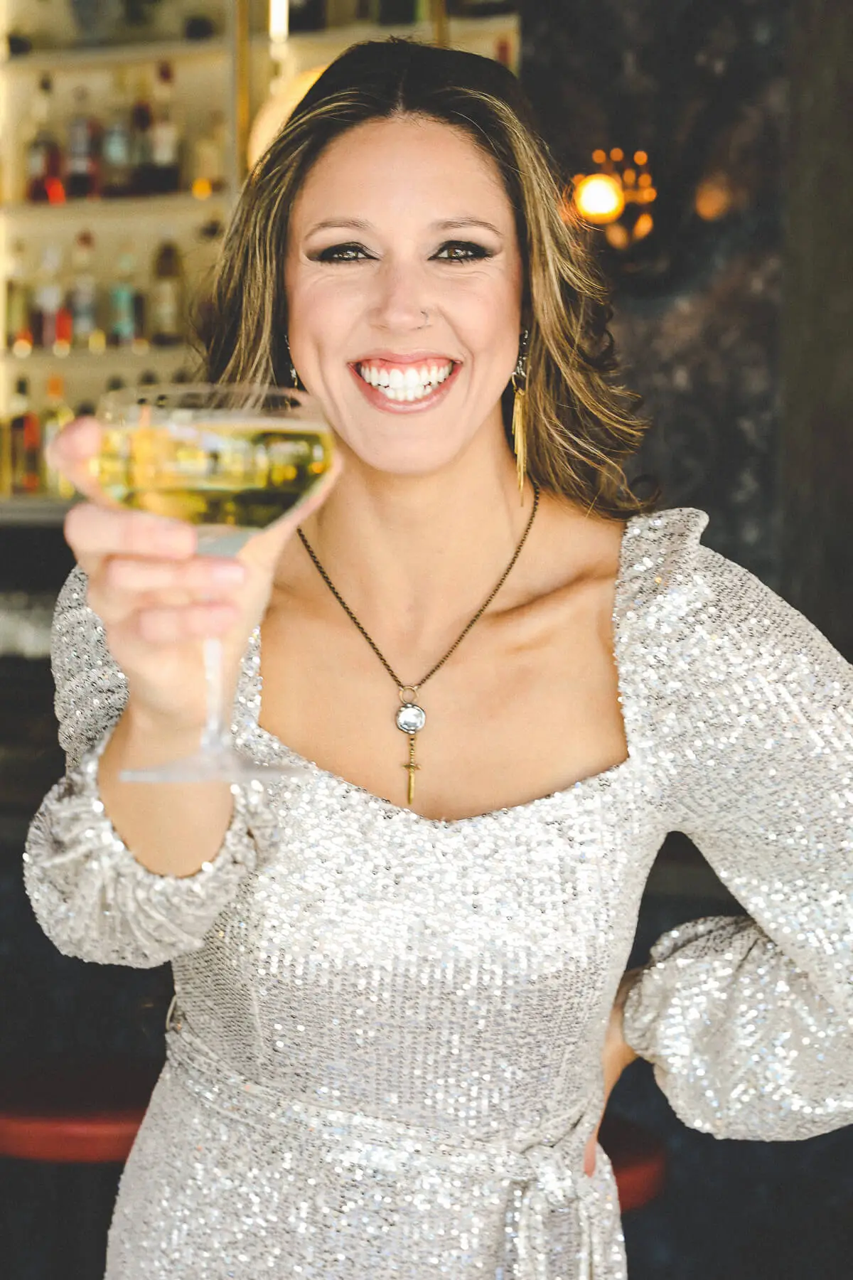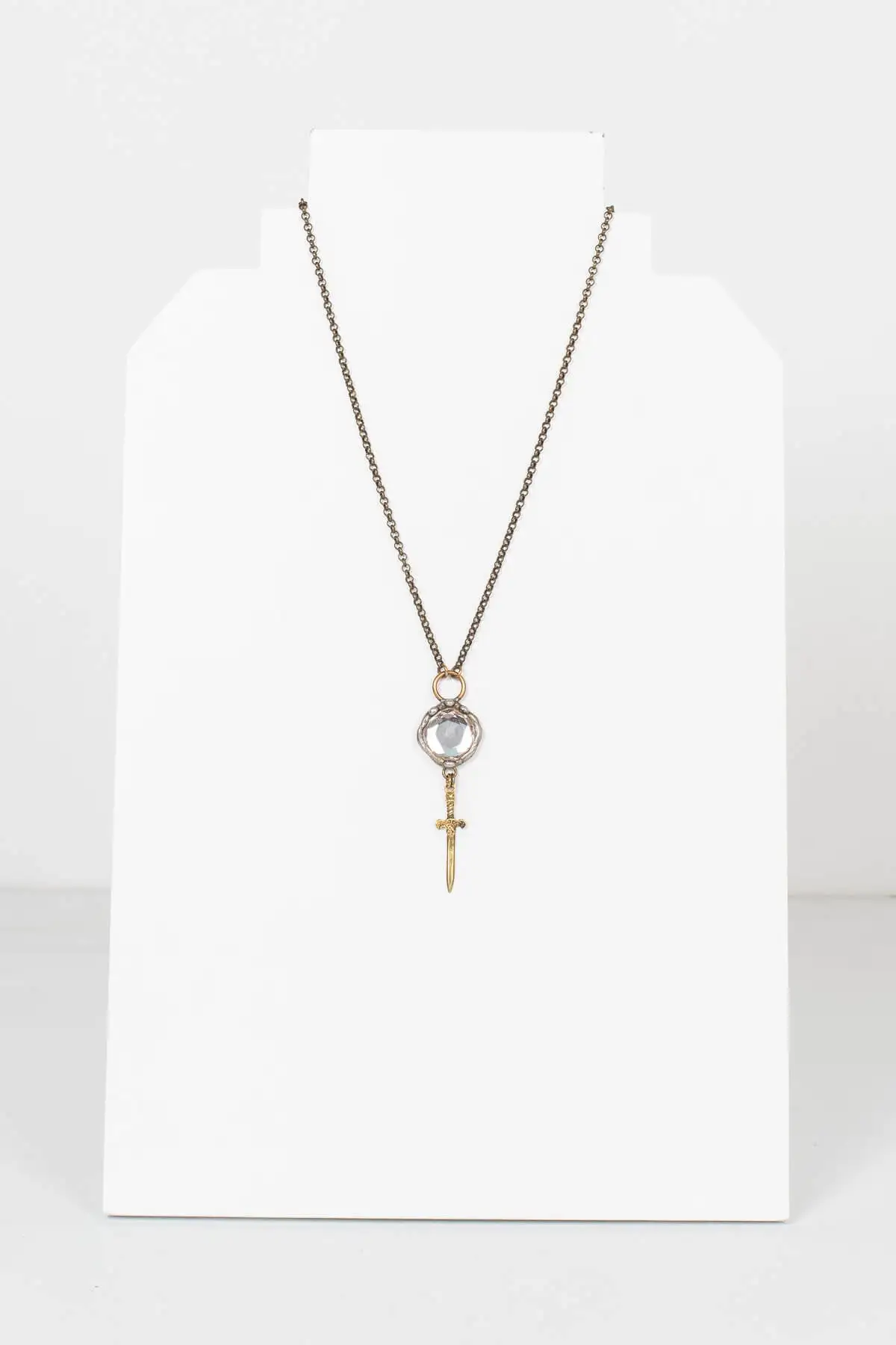 The Crystal With Sword Charm Necklace is unlike any other design by Mikal Winn. The sword charm adds the finishing touch to this already stunning necklace.