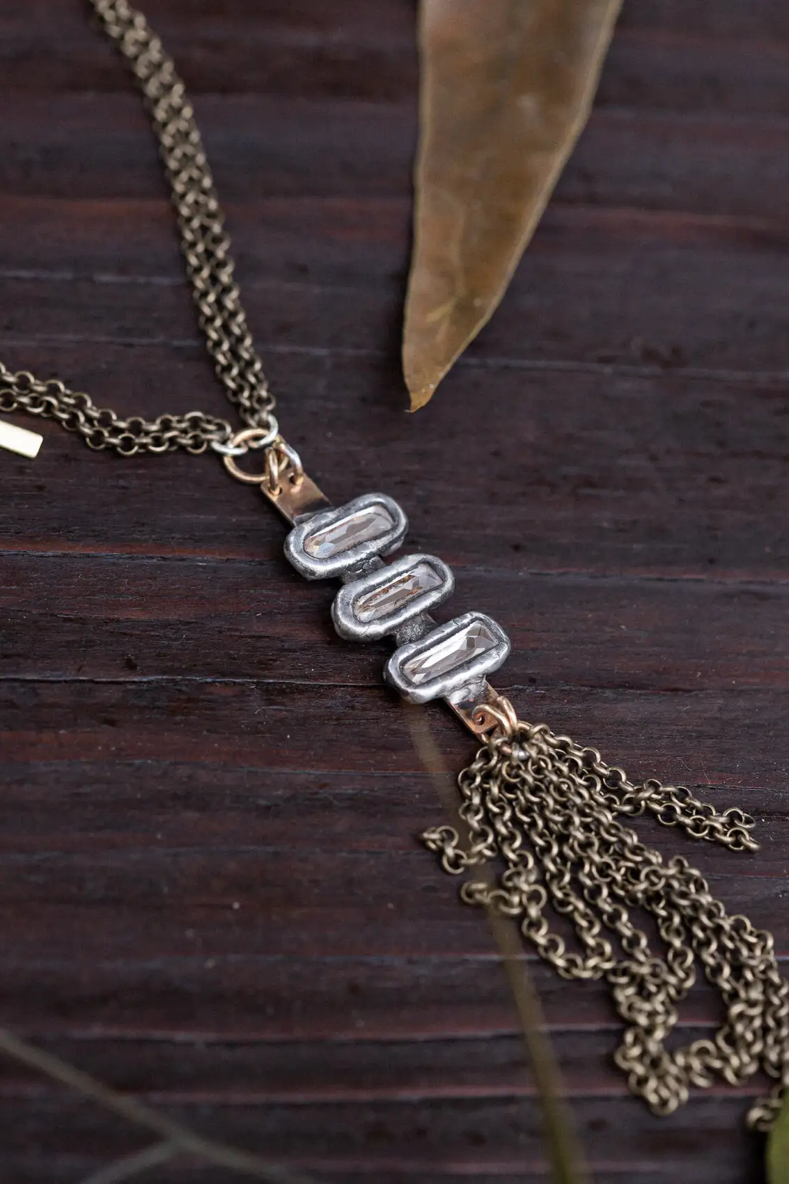 The Triple Crystal Fringe Necklace by Mikal Winn, features three Swarovski Crystals with a brass chain fringe detail.
