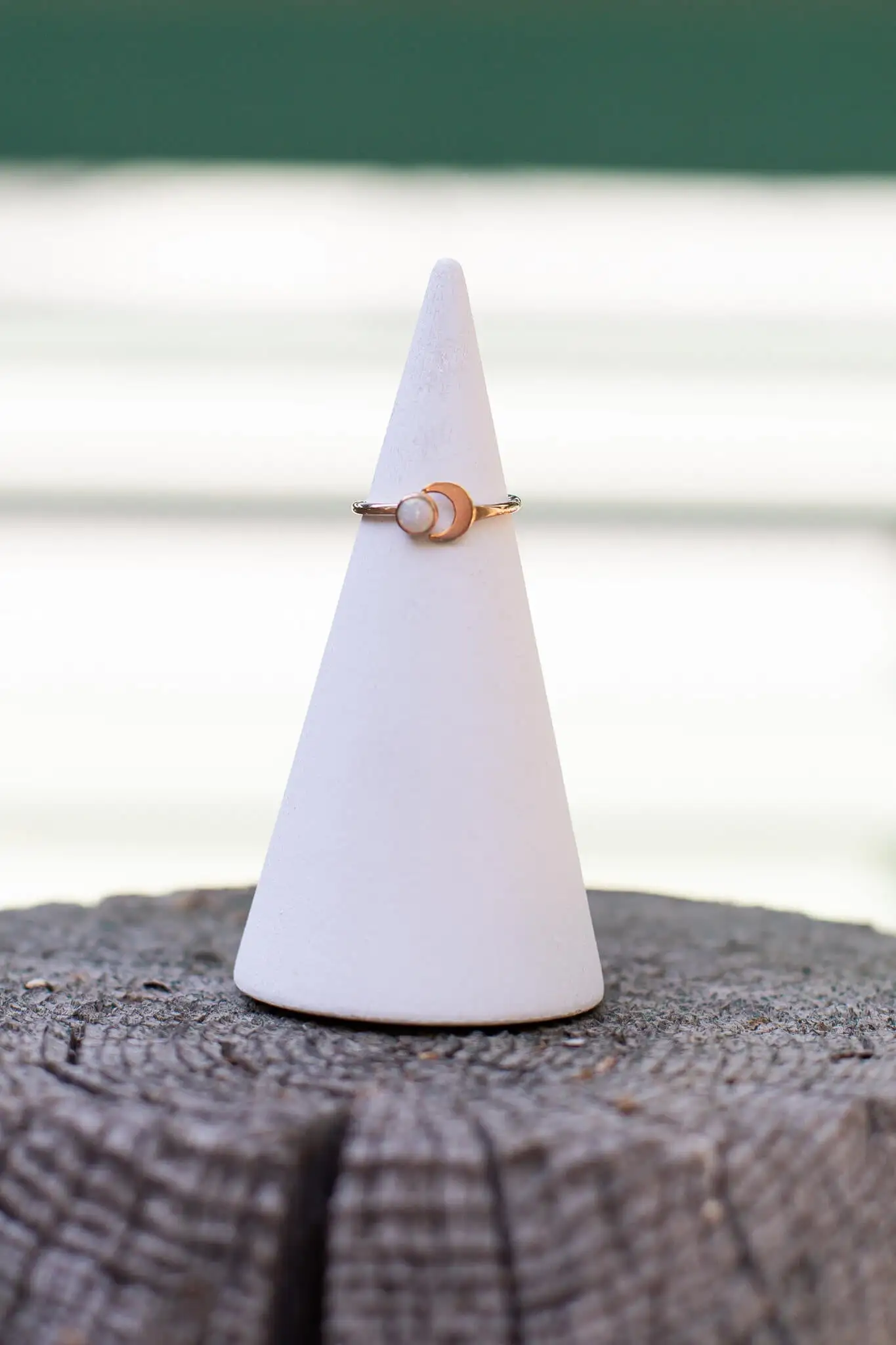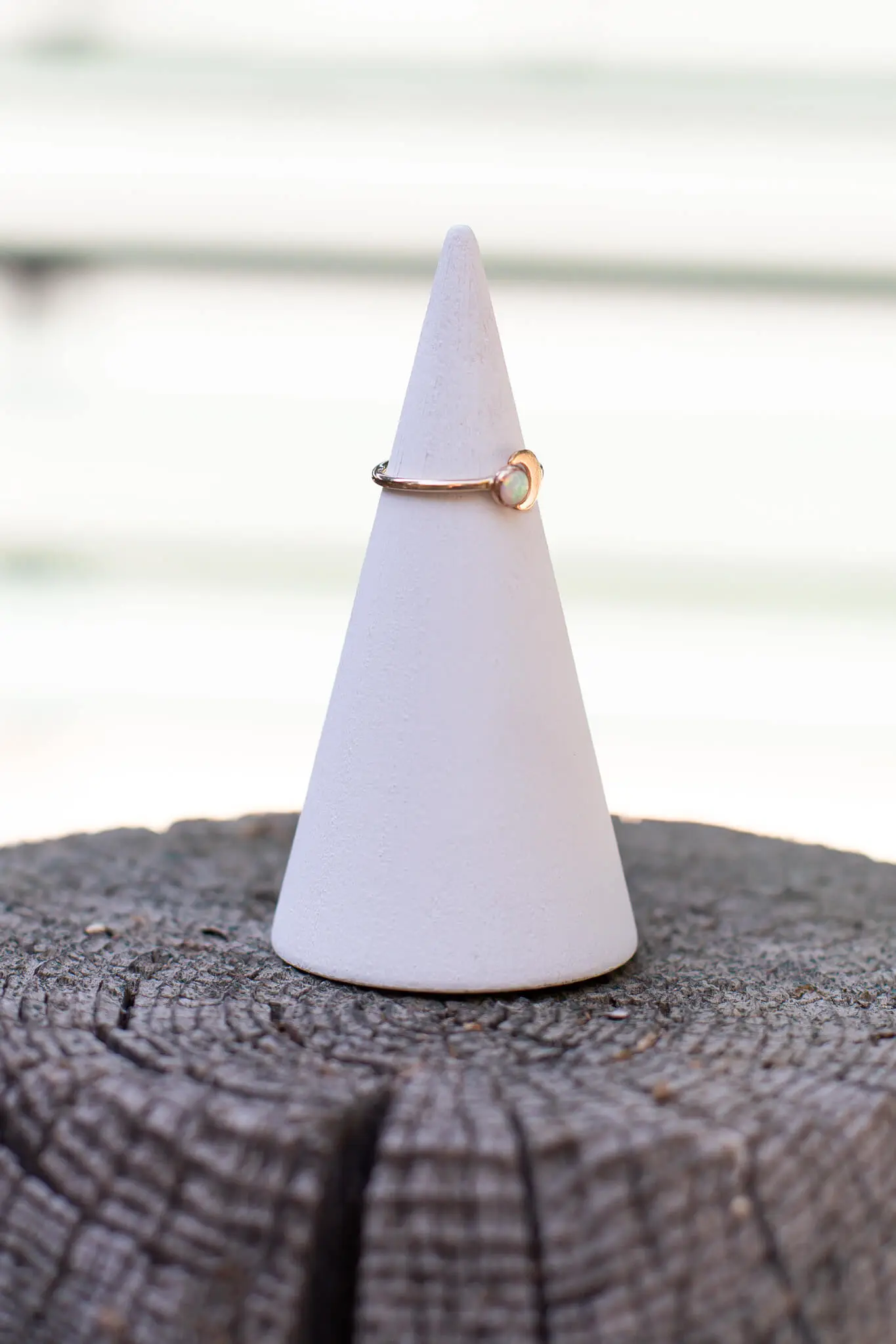The Luna ring is an open ring on both ends with a goldfill crescent moon on one side and a bezel set lab cultured opal on the other side. Band is 14k goldfill.