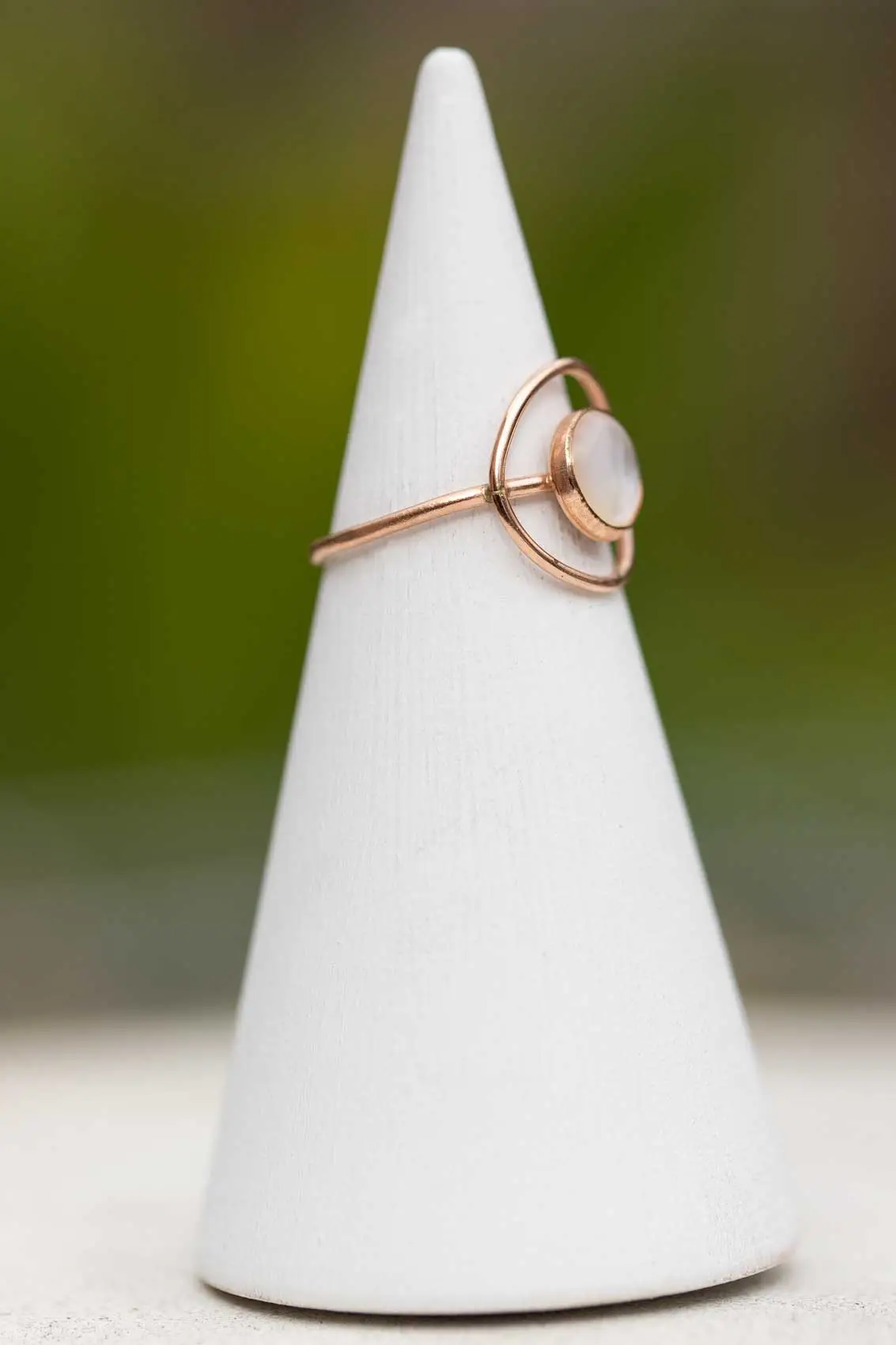 This ring is hand-formed in 14k goldfill and set with Mother of Pearl. Mother of Pearl is an iridescent, organic resilient material. 18 Gauge wire thickness 8mm Mother of Pearl Polished finish.
