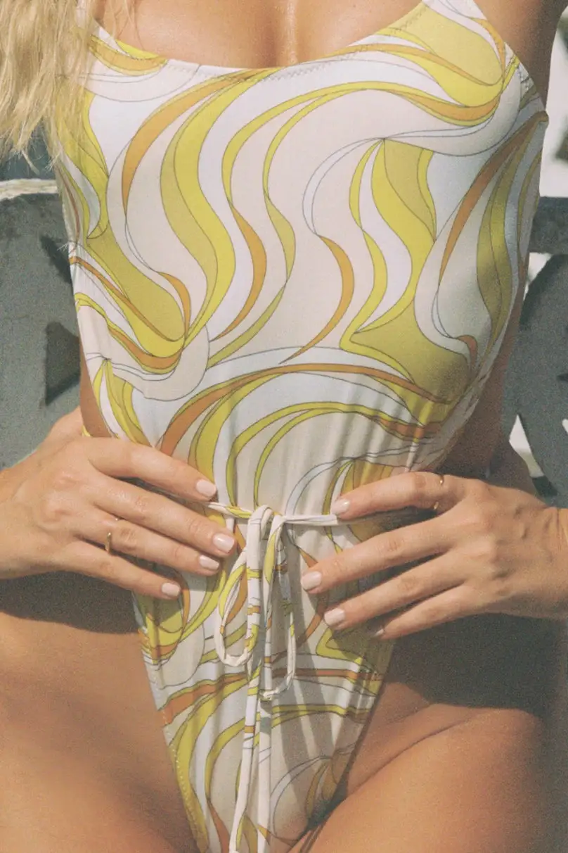 The Vintage One Piece by Monica Hansen features a sexy silhouette with high legs and skinny spaghetti straps.