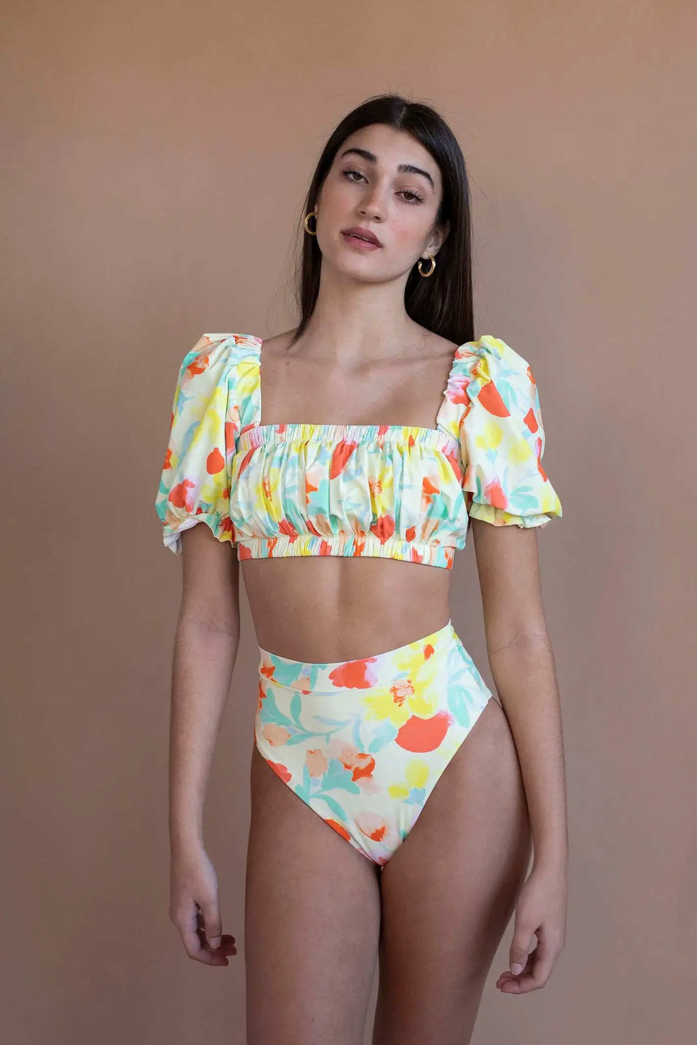 This fun and flirty bikini top has a flattering square neck, pull-over top and it even doubles as swim or apparel! Its puff sleeve and ruched detailing make it a must-have silhouette for all your vacays! And makes going to the beach and taking on a night out into the town so much easier.