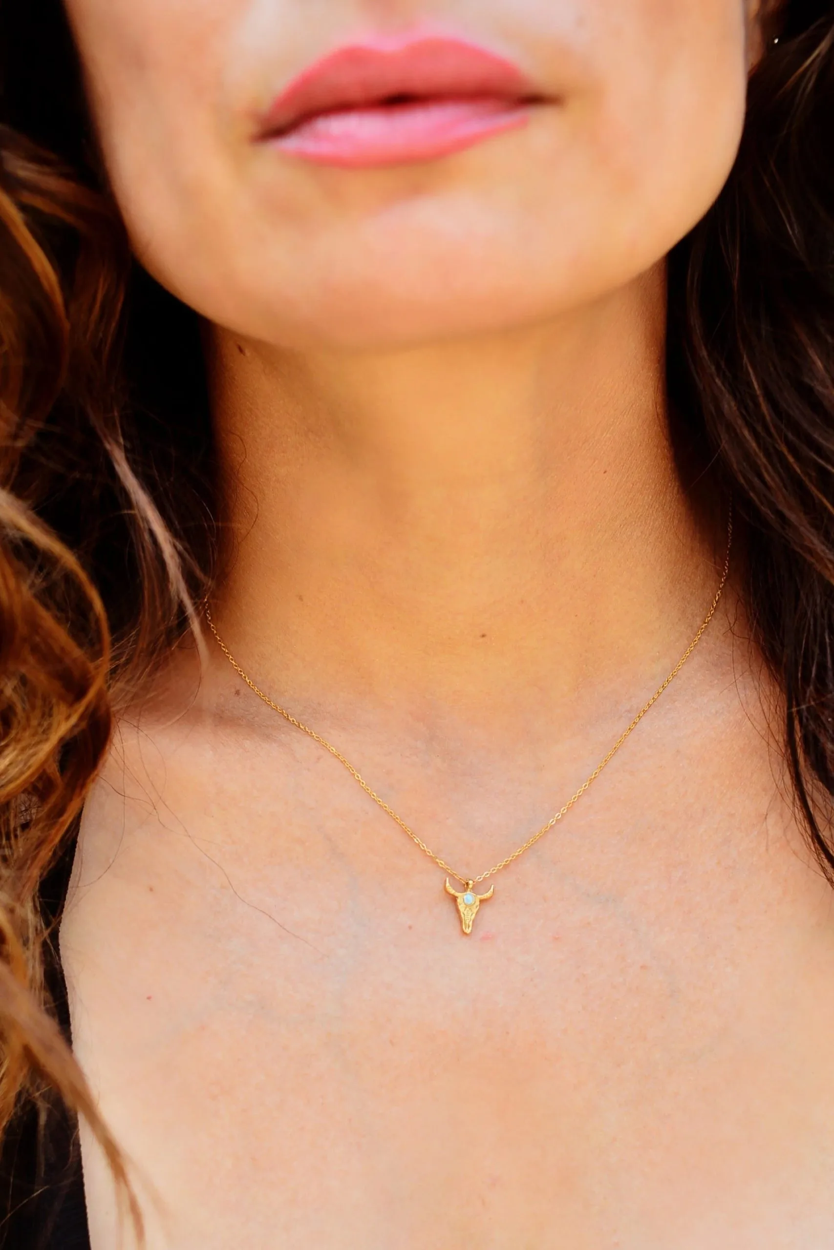The Toro Necklace by Montestruque features a bull head pendant with an opal accent stone.