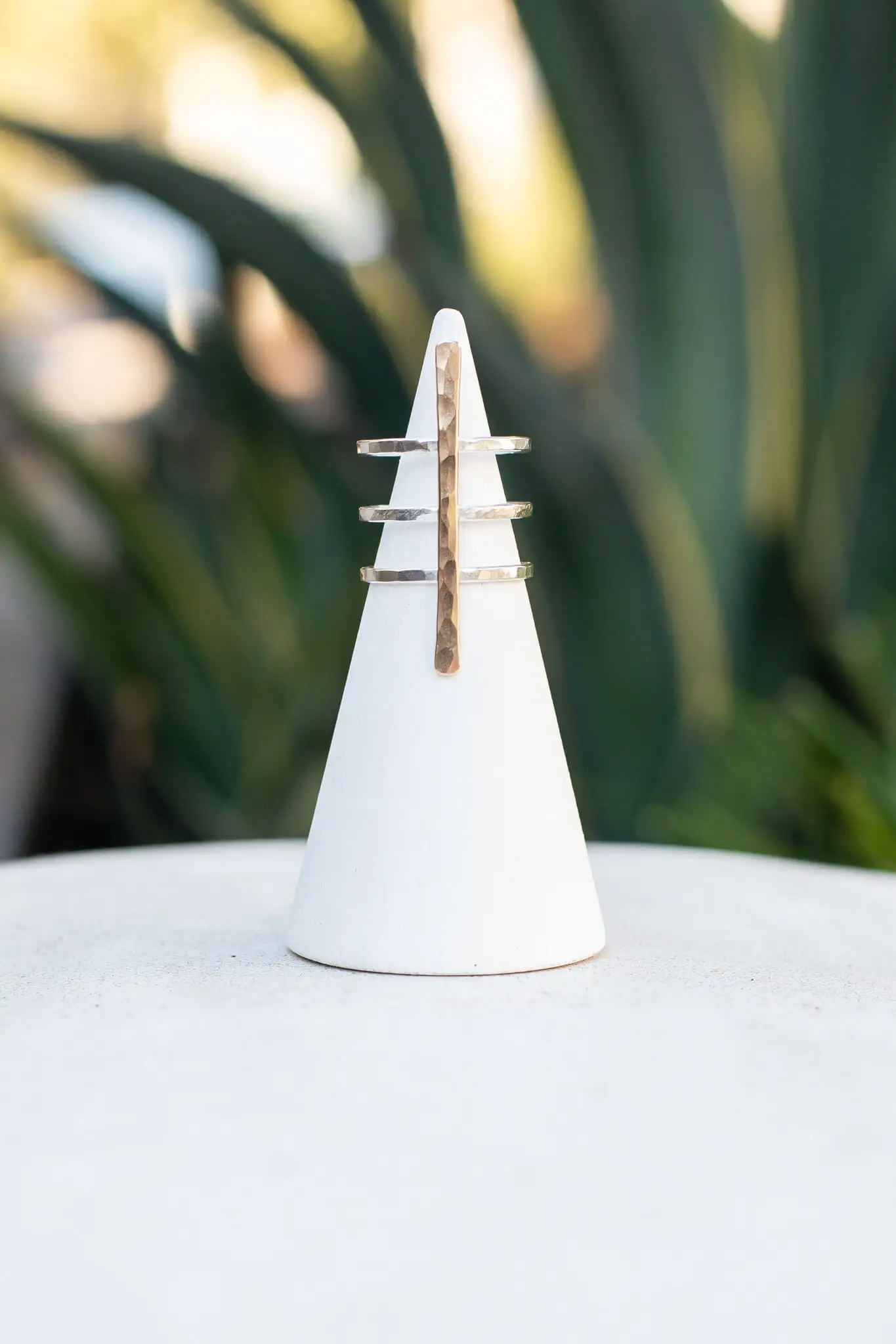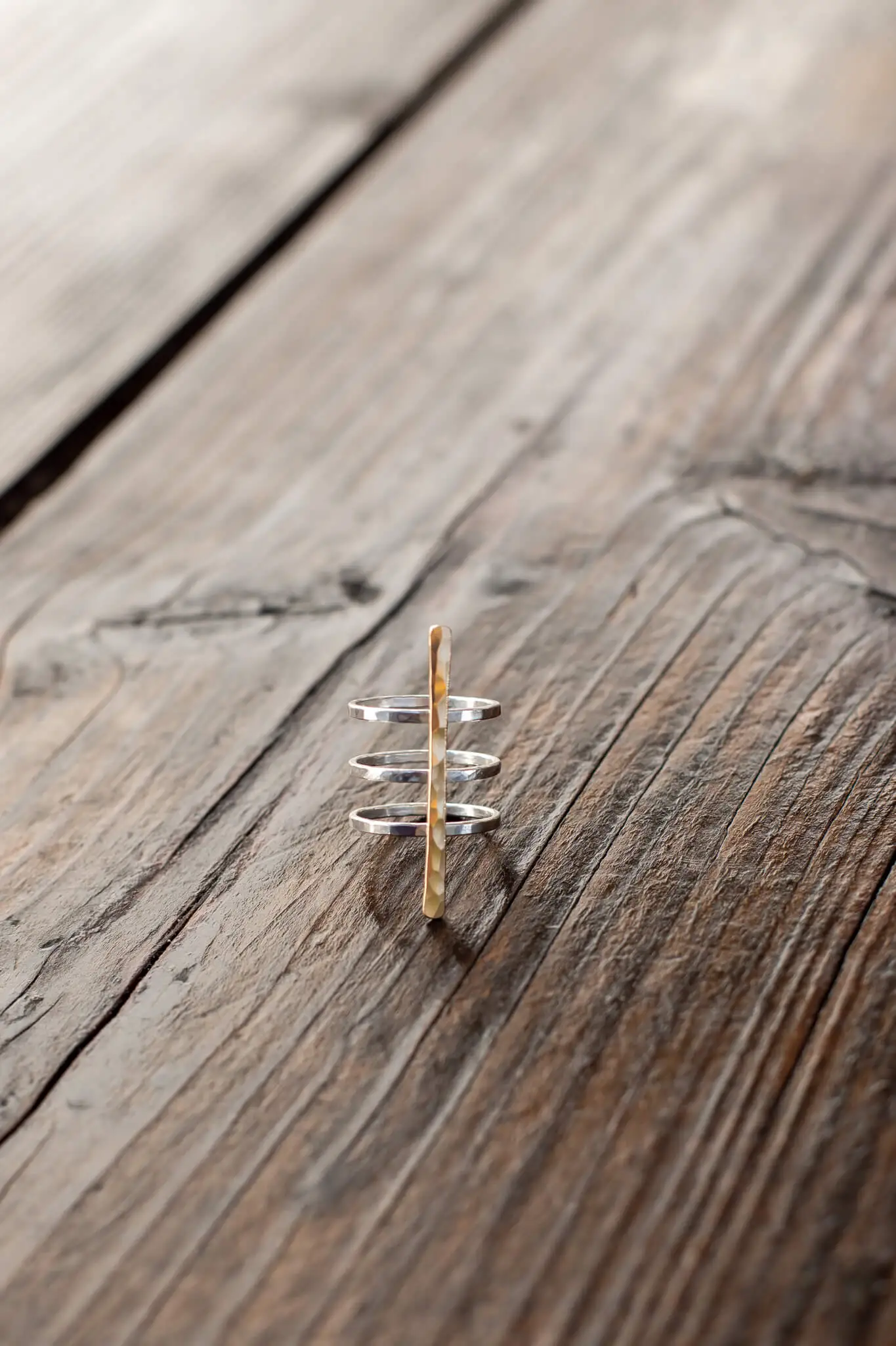 Hand made in Bend, Oregon, the Ladder Ring by Nashelle features a sparking, hand forged bar resting atop three silver rungs with alternating textures.