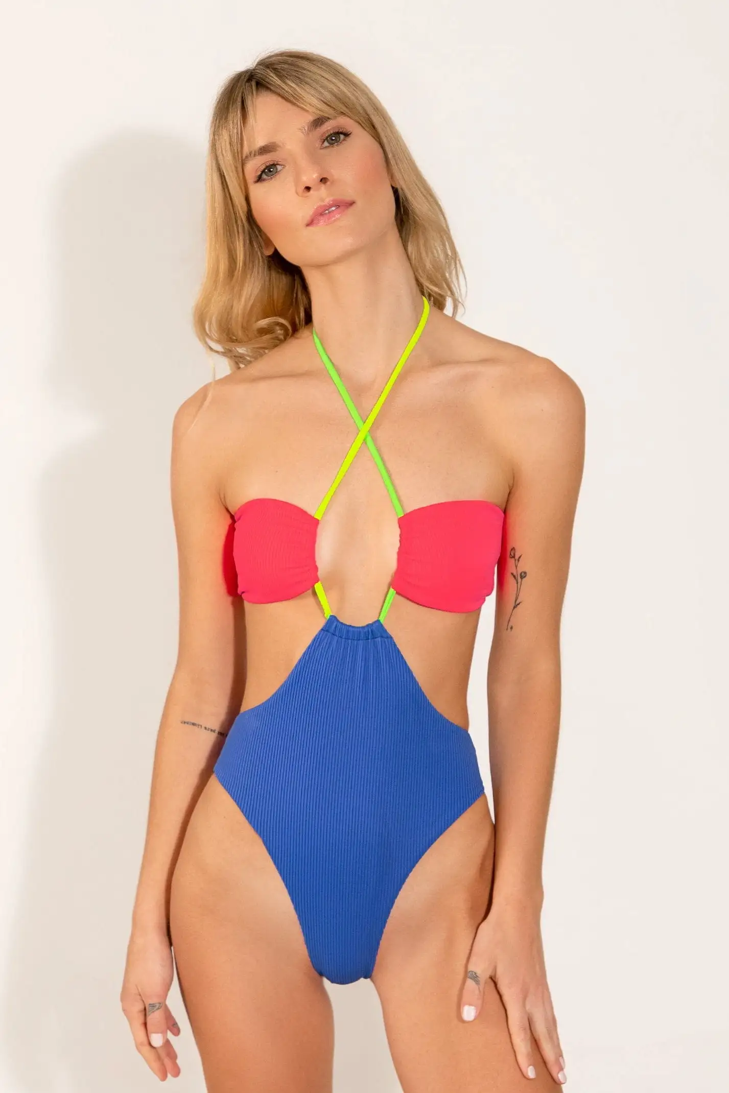 The Scarlet One Piece from ONEONE Swim feature a criss cross bandeau silhouette in a colorblock design.