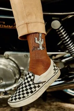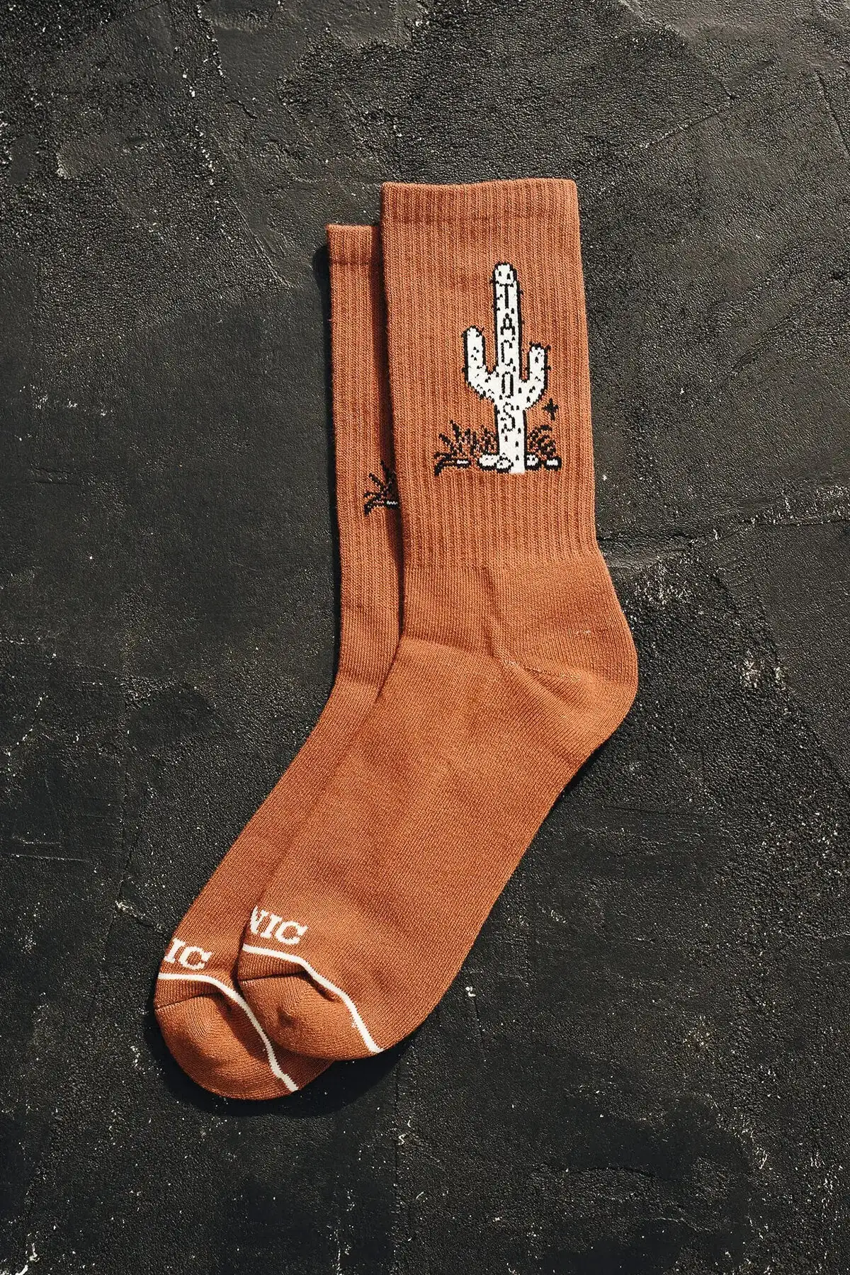 These half terry crew socks by Pyknic feature “TACOS” on a cactus knit on both sides.