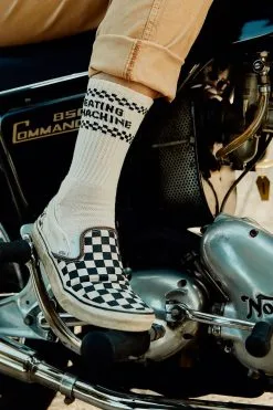These half terry crew socks by Pyknic feature a black and white checkerboard design with “eating machine” knit on both sides.