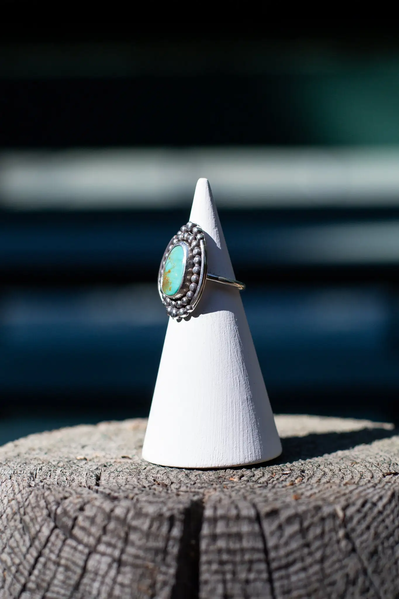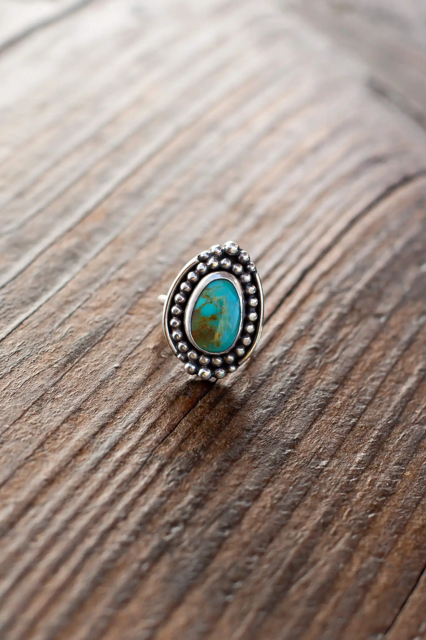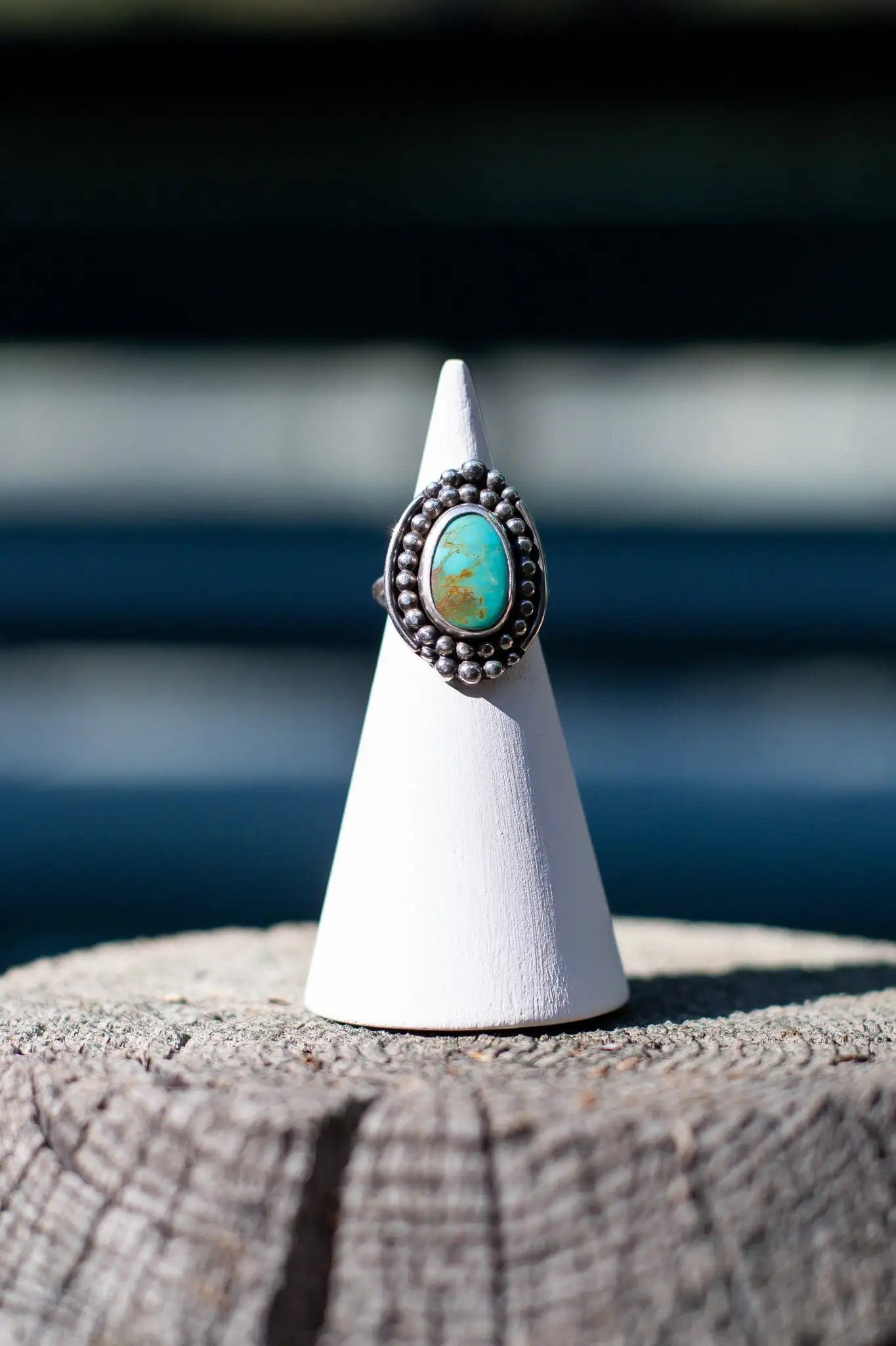 This one-of-a-kind Polar Bead Ring by Raegan Hough Metalsmith is hand fabricated with American Turquoise and set in Sterling Silver.