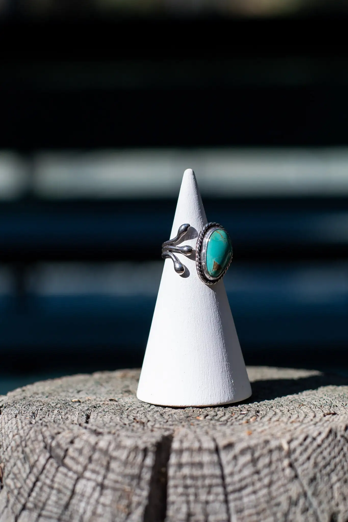 This one-of-a-kind Rope +Shank ring by Raegan Hough Metalsmith is hand fabricated with American Turquoise and set in Sterling Silver.