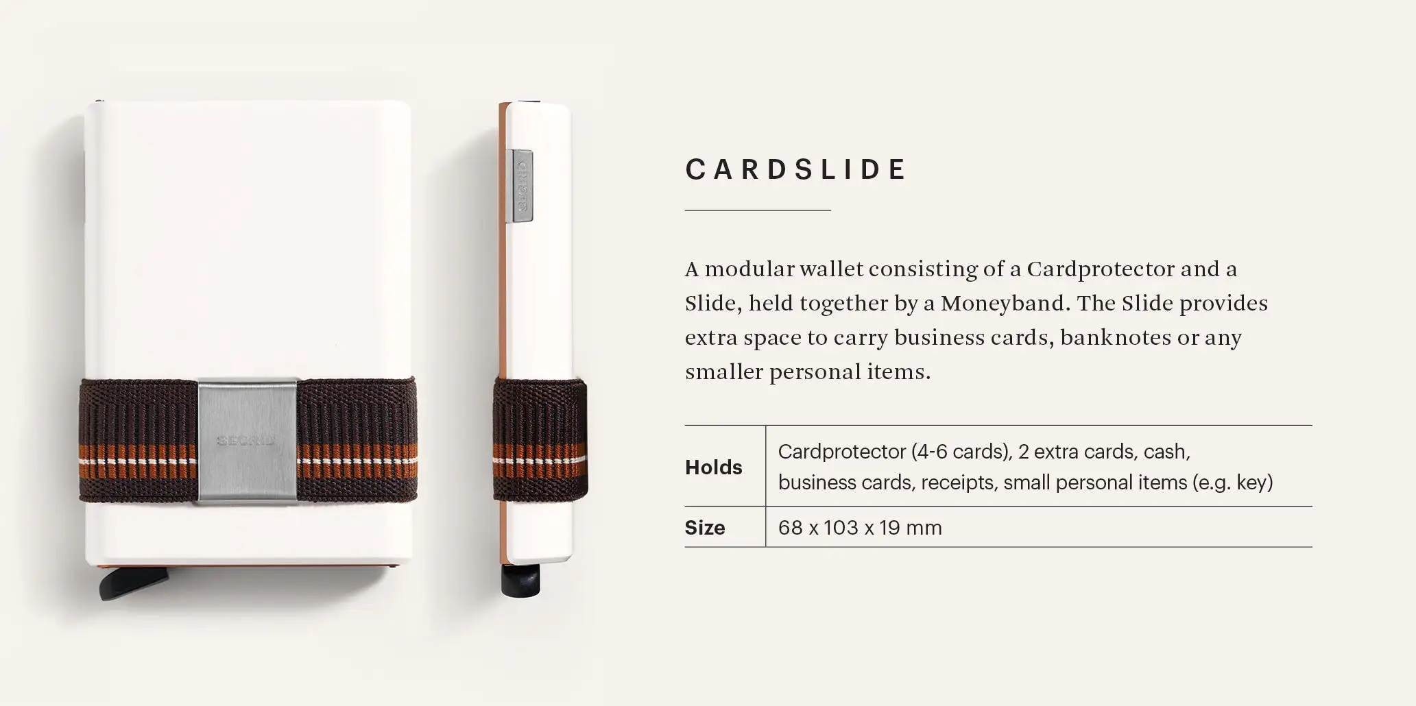 The Cardslide is a modular wallet consisting of a Cardprotector and a Slide, held together by a Moneyband. The extendable Slide provides extra space to carry business cards, banknotes, coins and small personal items.