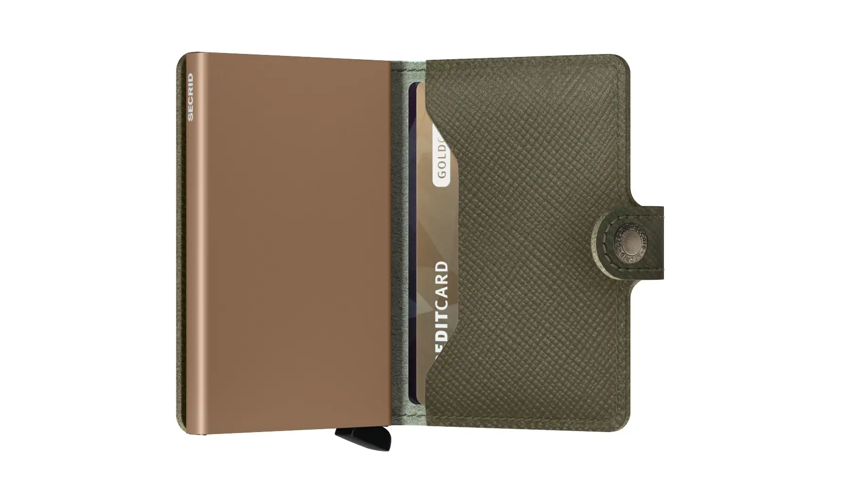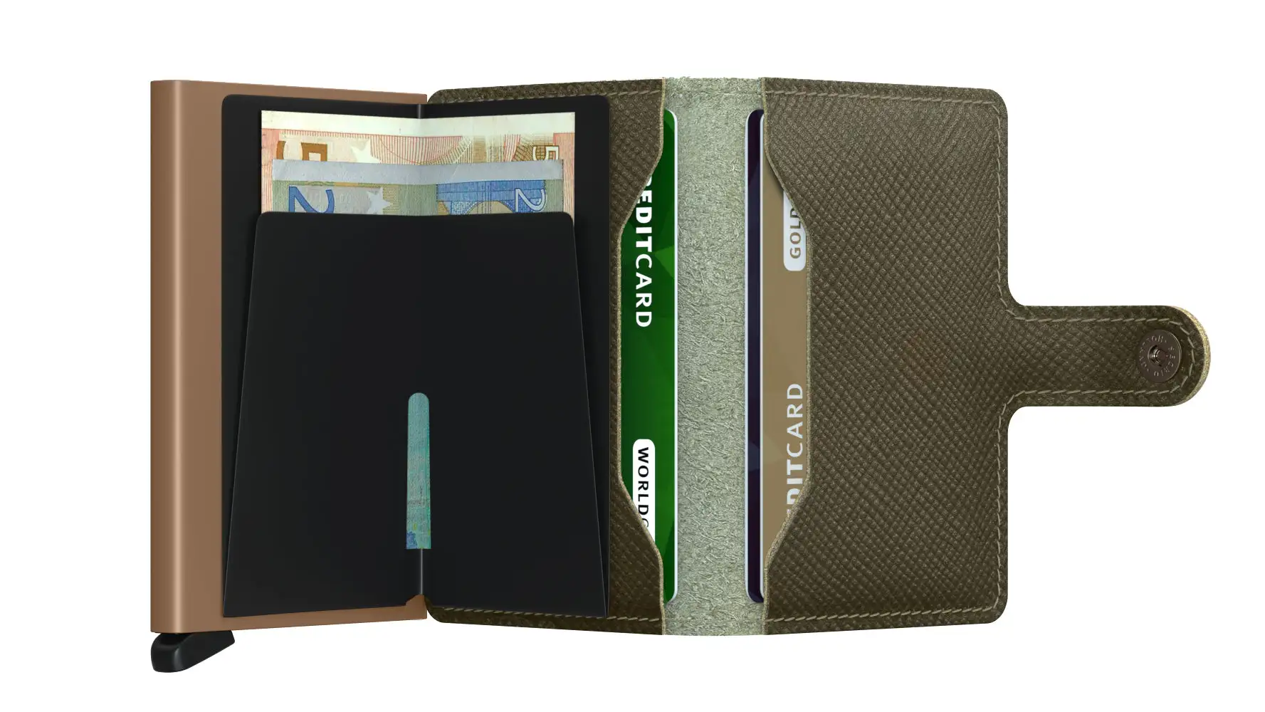 Small in size and surprisingly large in storage capacity, the Mini Wallet by SECRID combines the best of both worlds. The exterior holds banknotes, receipt and cards, while the aluminium Cardprotector allows you to slide out cards with one simple motion and protects them from bending, breaking and unwanted wireless communication.