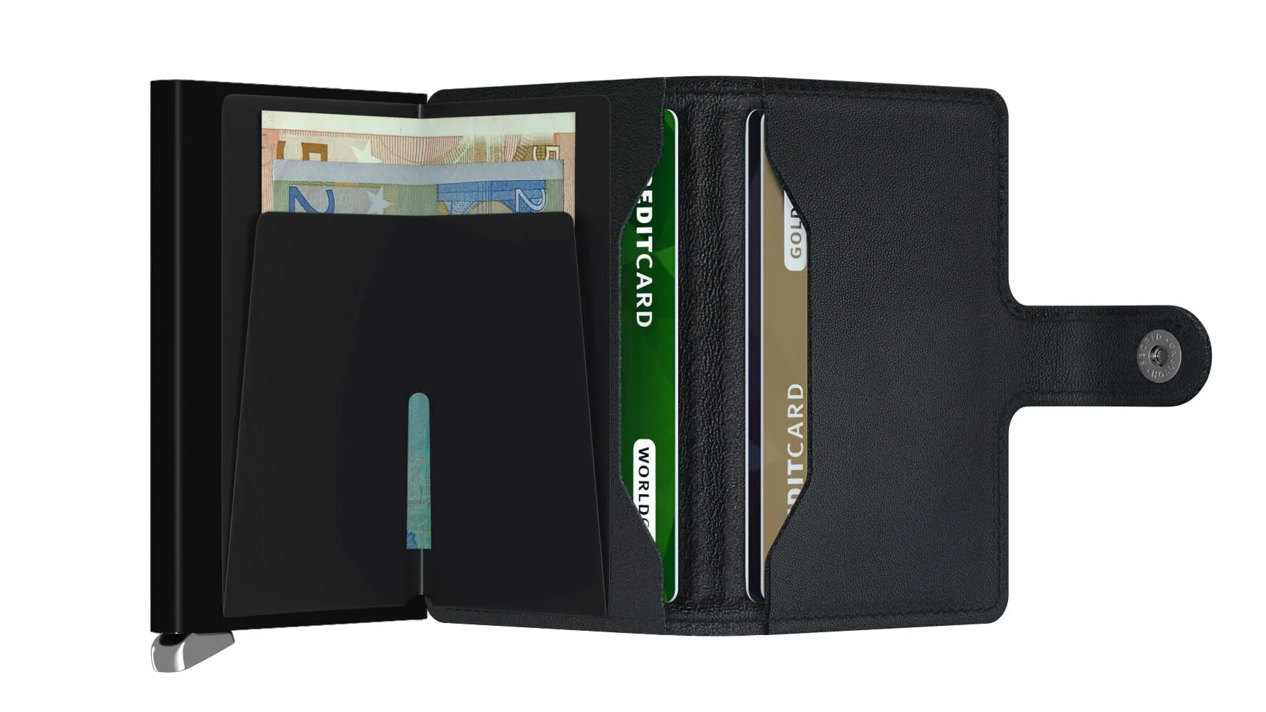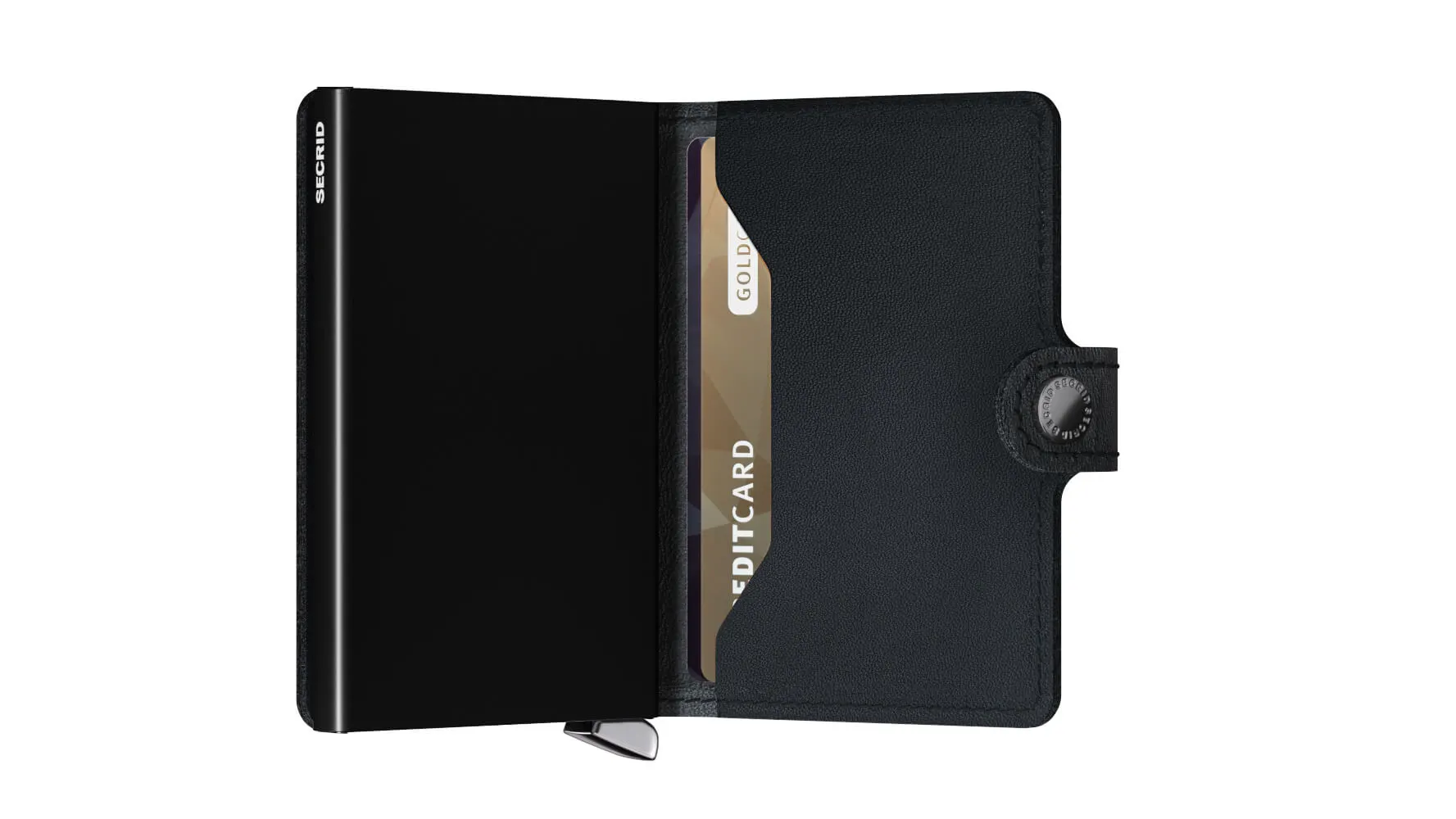Small in size and surprisingly large in storage capacity, the Mini Wallet by SECRID combines the best of both worlds. The exterior holds banknotes, receipt and cards, while the aluminium Cardprotector allows you to slide out cards with one simple motion and protects them from bending, breaking and unwanted wireless communication.