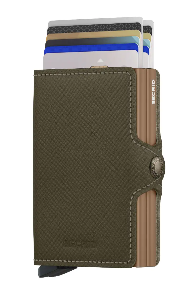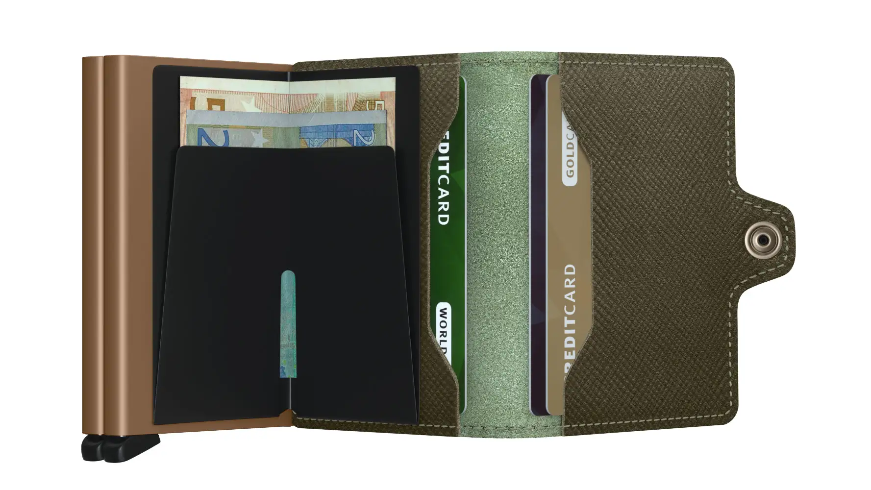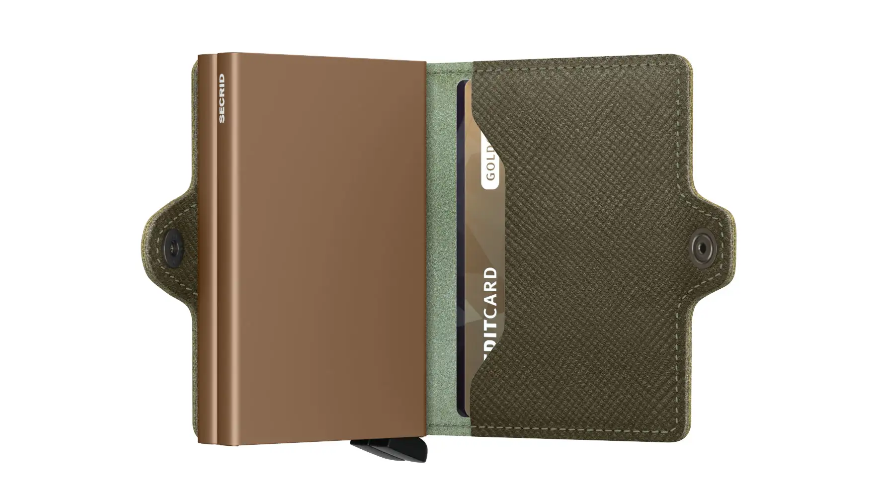 With two card protectors to hold double the content, the Twin Wallet carries up to 16 cards, banknotes and receipts, but remains compact in size.